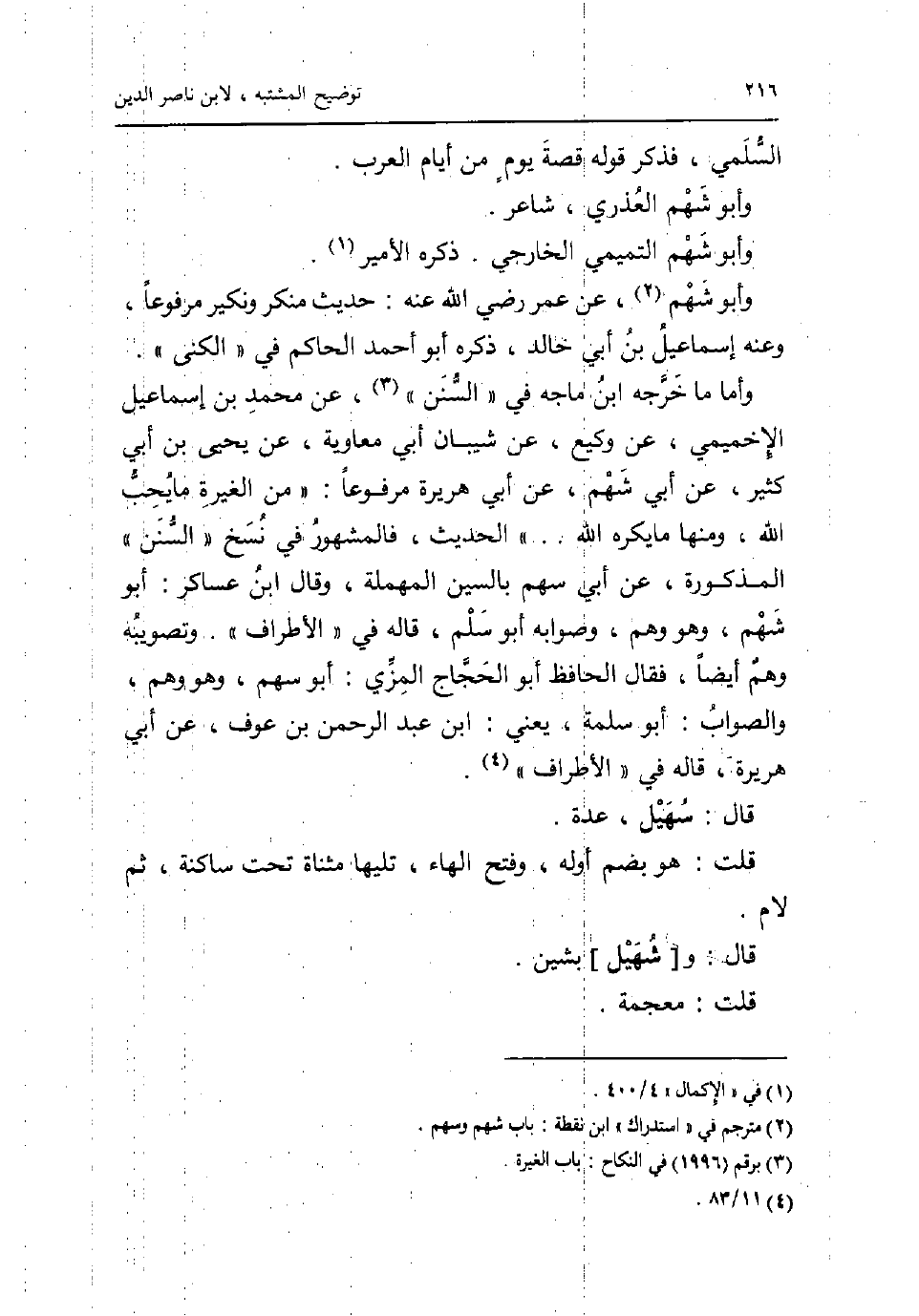 السّلمِيّ فَذكر قَوْله قصَّة يَوْم من أَيَّام الْعَرَب وَأَبُو شهم العذري شَاعِر وَأَبُو شهم التَّمِيمِي الْخَارِجِي ذكره الْأَمِير وَأَبُو شهم عَن عمر رَضِي الله عَنهُ: حَدِيث مُنكر وَنَكِير مَرْفُوعا وَعنهُ إِسْمَاعِيل بن أبي خَالِد ذكره أَبُو أَحْمد الْحَاكِم فِي الكنى وَأما مَا خرجه ابْن مَاجَه فِي السّنَن عَن مُحَمَّد بن إِسْمَاعِيل الاخميمي عَن وَكِيع عَن شَيبَان أبي مُعَاوِيَة عَن يحيى بن أبي كثير عَن أبي شهم عَن أبي هُرَيْرَة مَرْفُوعا: من الْغيرَة مَا يحب الله وَمِنْهَا مَا يكره الله الحَدِيث فَالْمَشْهُور فِي نسخ السّنَن الْمَذْكُورَة عَن أبي سهم بِالسِّين الْمُهْملَة وَقَالَ ابْن عَسَاكِر: أَبُو شهم وَهُوَ وهم وَصَوَابه أَبُو سلم قَالَه فِي الْأَطْرَاف وتصويبه وهم ايضا فَقَالَ الْحَافِظ أَبُو الْحجَّاج الْمزي: أَبُو سهم وَهُوَ وهم وَالصَّوَاب: أَبُو سَلمَة يَعْنِي: ابْن عبد الرَّحْمَن بن عَوْف عَن أبي هُرَيْرَة قَالَه فِي الْأَطْرَاف قَالَ: سُهَيْل عدَّة قلت: هُوَ بِضَم اوله وَفتح الْهَاء تَلِيهَا مثناة تَحت سَاكِنة ثمَّ لَام قَالَ: و [شهيل] بشين قلت: مُعْجمَة.