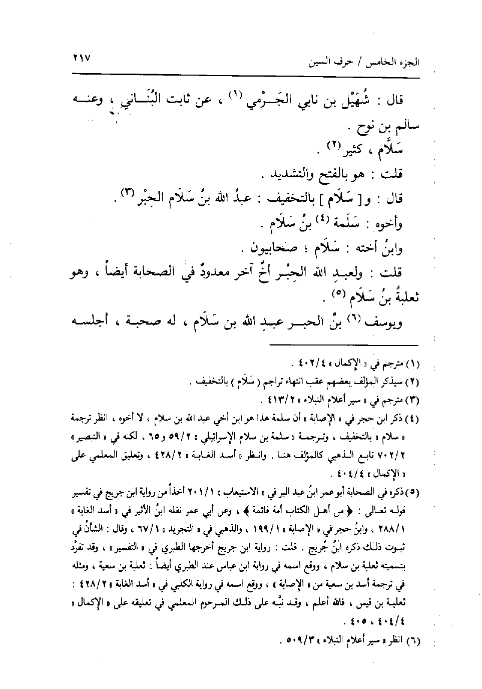 قَالَ: شهيل بن نابي الْجرْمِي عَن ثَابت الْبنانِيّ وَعنهُ سَالم بن نوح سَلام كثير قلت: هُوَ بِالْفَتْح وَالتَّشْدِيد قَالَ: و [سَلام] بِالتَّخْفِيفِ: عبد الله بن سَلام الحبر وَأَخُوهُ: سَلمَة بن سَلام وَابْن أُخْته: سَلام صحابيون قلت: ولعَبْد الله الحبر أَخ آخر مَعْدُود فِي الصَّحَابَة ايضا وَهُوَ ثَعْلَبَة بن سَلام ويوسف بن الحبر عبد الله بن سَلام لَهُ صُحْبَة أجلسه