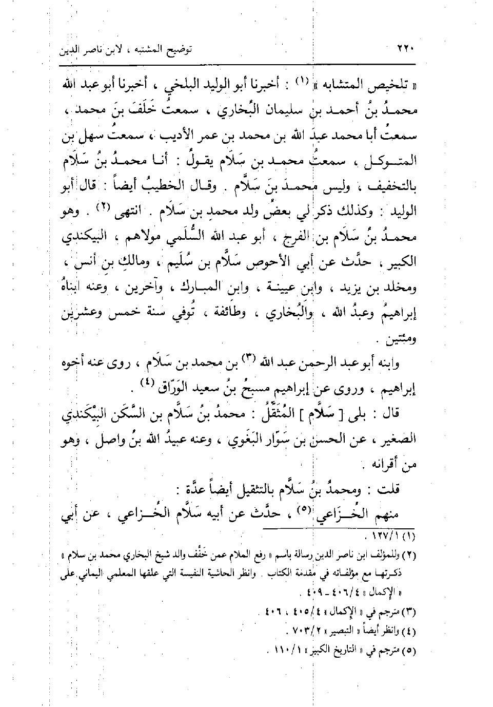 تَلْخِيص الْمُتَشَابه: أخبرنَا أَبُو الْوَلِيد الْبَلْخِي أخبرنَا أَبُو عبد الله مُحَمَّد بن أَحْمد بن سُلَيْمَان البُخَارِيّ سَمِعت خلف بن مُحَمَّد سَمِعت أَبَا مُحَمَّد عبد الله بن مُحَمَّد بن عمر الاديب سَمِعت سهل بن المتَوَكل سَمِعت مُحَمَّد بن سَلام يَقُول: أَنا مُحَمَّد بن سَلام بِالتَّخْفِيفِ وَلَيْسَ مُحَمَّد بن سَلام وَقَالَ الْخَطِيب أَيْضا: قَالَ أَبُو الْوَلِيد: وَكَذَلِكَ ذكر لي بعض ولد مُحَمَّد بن سَلام انْتهى وَهُوَ مُحَمَّد بن سَلام بن الْفرج أَبُو عبد الله السّلمِيّ مَوْلَاهُم البيكندي الْكَبِير حدث عَن أبي الاحوص سَلام بن سَلام وَمَالك بن أنس ومخلد بن يزِيد وَابْن عُيَيْنَة وَابْن الْمُبَارك وَآخَرين وَعنهُ ابناه إِبْرَاهِيم وَعبد الله وَالْبُخَارِيّ وَطَائِفَة توفّي سنة خمس وَعشْرين ومئتين وأبنه أَبُو عبد الرَّحْمَن عبد الله بن مُحَمَّد بن سَلام روى عَنهُ اخوه ابراهيم وروى عَن إِبْرَاهِيم مسبح بن سعيد الْوراق قَالَ: بلَى [سَلام] المثقل: مُحَمَّد بن سَلام بن السكن البيكندي الصَّغِير عَن الْحسن بن سوار الْبَغَوِيّ وَعنهُ عبيد الله بن وَاصل وَهُوَ من اقرانه قلت: وَمُحَمّد بن سَلام بالتثقيل أَيْضا عدَّة: مِنْهُم الْخُزَاعِيّ حدث عَن أَبِيه سَلام الْخُزَاعِيّ عَن أبي