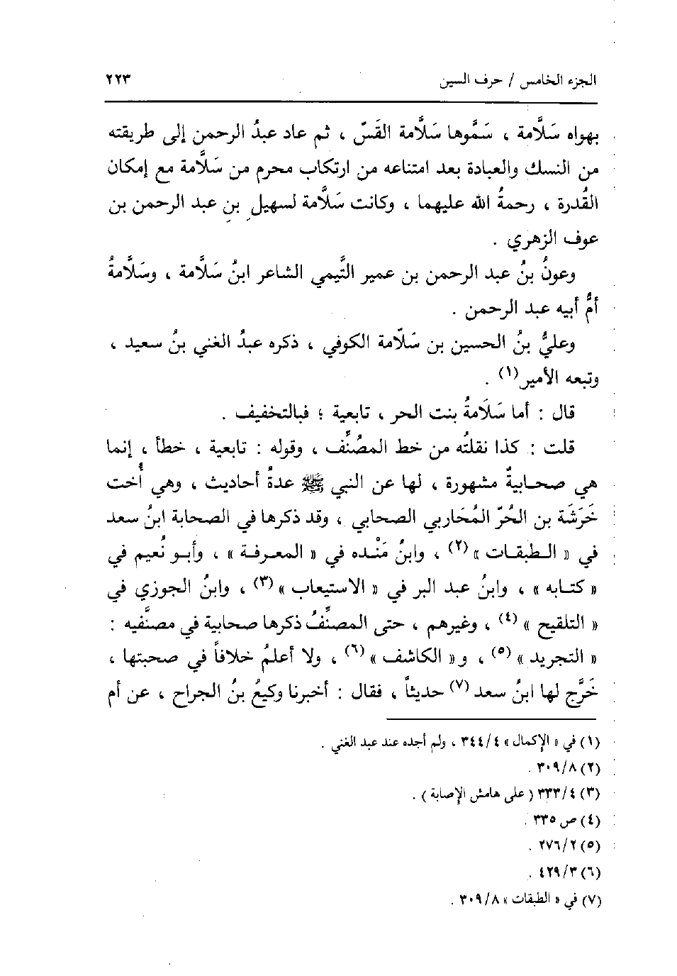 بهواة سَلامَة سَموهَا سَلامَة القس ثمَّ عَاد عبد الرَّحْمَن إِلَى طَرِيقَته من النّسك وَالْعِبَادَة بعد امْتِنَاعه من ارْتِكَاب محرم من سَلامَة مَعَ إِمْكَان الْقُدْرَة رَحمَه الله عَلَيْهِمَا وَكَانَت سَلامَة لسهيل بن عبد الرَّحْمَن بن عَوْف الزُّهْرِيّ وَعَن بن عبد الرَّحْمَن بن عُمَيْر التَّيْمِيّ الشَّاعِر ابْن سَلامَة وسلامة أم أَبِيه عبد الرَّحْمَن وَعلي بن الْحُسَيْن بن سَلامَة الْكُوفِي ذكره عبد الْغَنِيّ بن سعيد وَتَبعهُ الْأَمِير قَالَ: أما سَلامَة بنت الْحر تابعية فبالتخفيف قلت: كَذَا نقلته من خطّ المُصَنّف وَقَوله: تابعية خطأ إِنَّمَا هِيَ صحابية مَشْهُورَة لَهَا عَن النَّبِي صلى الله عَلَيْهِ وَسلم عدَّة احاديث وَهِي اخت خَرشَة بن الْحر الْمحَاربي الصَّحَابِيّ وَقد ذكرهَا فِي الصَّحَابَة ابْن سعد فِي الطَّبَقَات وَابْن مَنْدَه فِي الْمعرفَة وَأَبُو نعيم فِي كِتَابه وَابْن عبد الْبر فِي الِاسْتِيعَاب وَابْن الْجَوْزِيّ فِي التلقيح وَغَيرهم حَتَّى المُصَنّف ذكرهَا صحابية فِي مصنفية: التَّجْرِيد والكاشف وَلَا أعلم خلافًا فِي صحبتهَا خرج لَهَا ابْن سعد حَدِيثا فَقَالَ: أخبرنَا وَكِيع بن الْجراح عَن أم