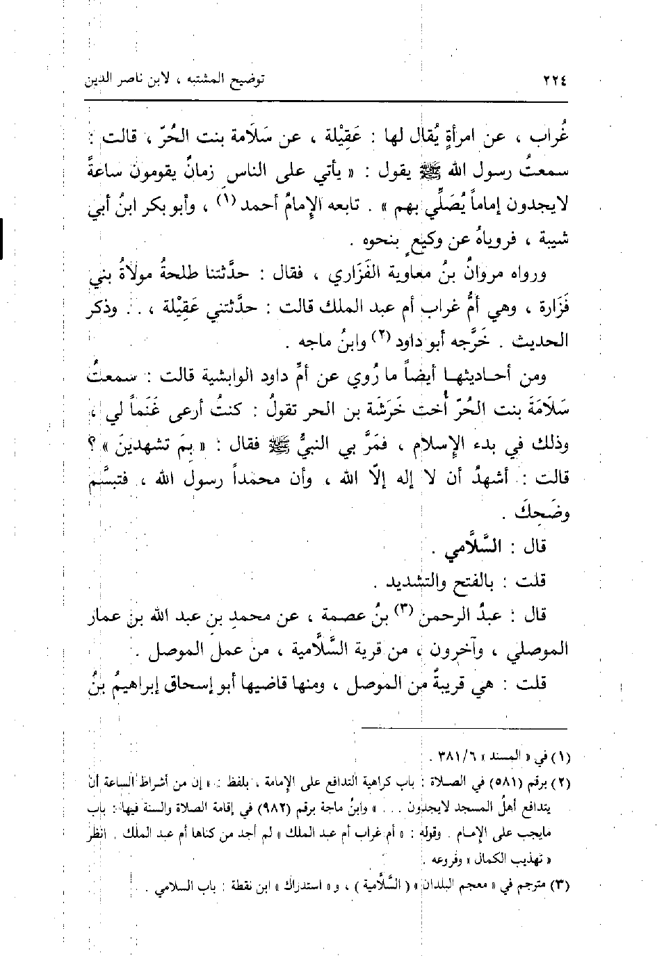 غراب عَن امْرَأَة يُقَال لَهَا: عقيلة عَن سَلامَة بنت الْحر قَالَت: سَمِعت رَسُول الله صلى الله عَلَيْهِ وَسلم يَقُول يَأْتِي على النَّاس زمَان يقومُونَ سَاعَة لَا يَجدونَ إِمَامًا يُصَلِّي بهم تَابعه الإِمَام أَحْمد وَأَبُو بكر ابْن أبي شيبَة فروياه عَن وَكِيع بِنَحْوِهِ وَرَوَاهُ مَرْوَان بن مُعَاوِيَة الْفَزارِيّ فَقَالَ: حَدَّثتنَا طَلْحَة مولاة بني فَزَارَة وَهِي أم غراب أم عبد الْملك قَالَت: حَدَّثتنِي عقيلة وَذكر الحَدِيث خرجه أَبُو دَاوُد وَابْن مَاجَه وَمن أحاديثها أَيْضا مَا رُوِيَ عَن أم دَاوُد الوابشية قَالَت: سَمِعت سَلامَة بن الْحر اخت خَرشَة بن الْحر تَقول: كنت ارعى إِنَّمَا لي وَذَلِكَ فِي بَدْء الاسلام فَمر بِي النَّبِي صلى الله عَلَيْهِ وَسلم فَقَالَ: بِمَ تشهدين؟ قَالَت: اشْهَدْ أَن لَا إِلَه إِلَّا الله وان مُحَمَّدًا رَسُول الله فَتَبَسَّمَ وَضحك قَالَ: السلَامِي قلت: بِالْفَتْح وَالتَّشْدِيد قَالَ عبد الرَّحْمَن بن عصمَة عَن مُحَمَّد بن عبد الله بن عمار الْموصِلِي وَآخَرُونَ من قَرْيَة السلامية من علم الْموصل قلت: هِيَ قريبَة من الْموصل وَمِنْهَا قاضيها أَبُو إِسْحَاق إِبْرَاهِيم بن