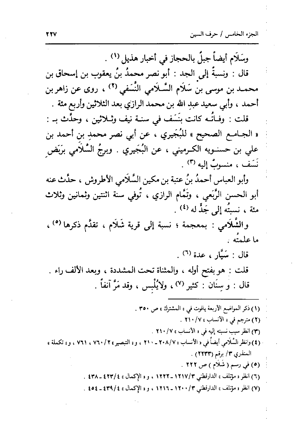 وَسَلام أَيْضا جبل بالحجاز فِي اخبار هُذَيْل قَالَ: وَنسبَة إِلَى الْجد: أَبُو نصر مُحَمَّد بن يَعْقُوب بن إِسْحَاق بن مُحَمَّد بن مُوسَى بن سَلام السلَامِي النَّسَفِيّ روى عَن زَاهِر بن أَحْمد وابي سعيد عبد الله بن مُحَمَّد الرَّازِيّ بعد الثَّلَاثِينَ وَأَرْبع مئة قلت: وَفَاته كَانَت بنسف فِي سنة نَيف وَثَلَاثِينَ وَحدث ب: قلت: وَفَاته كَانَت بنسف فِي سنة نَيف وَثَلَاثِينَ وَحدث ب الْجَامِع الصَّحِيح للبجيري عَن أبي نصر مُحَمَّد بن أَحْمد بن عَليّ بن حسنويه الكرميني عَن البجيري وبرج السلَامِي بربض نسف مَنْسُوب إِلَيْهِ وَأَبُو الْعَبَّاس أَحْمد بن عتبَة بن مكين السلَامِي الاطروش حدث عَنهُ أَبُو الْحسن الربعِي وَتَمام الرَّازِيّ توفّي سنة اثْنَتَيْنِ وَثَمَانِينَ وَثَلَاث مئة نسبته إِلَى جد لَهُ والشلامي: بِمُعْجَمَة نِسْبَة إِلَى قَرْيَة شلام تقدم ذكرهَا مَا عَلمته قَالَ: سيار عدَّة قلت: هُوَ بِفَتْح اوله والمثناة تَحت الْمُشَدّدَة وَبعد الْألف رَاء قَالَ: وَسنَان: كثير وَلَا يلبس وَقد مر آنِفا.
