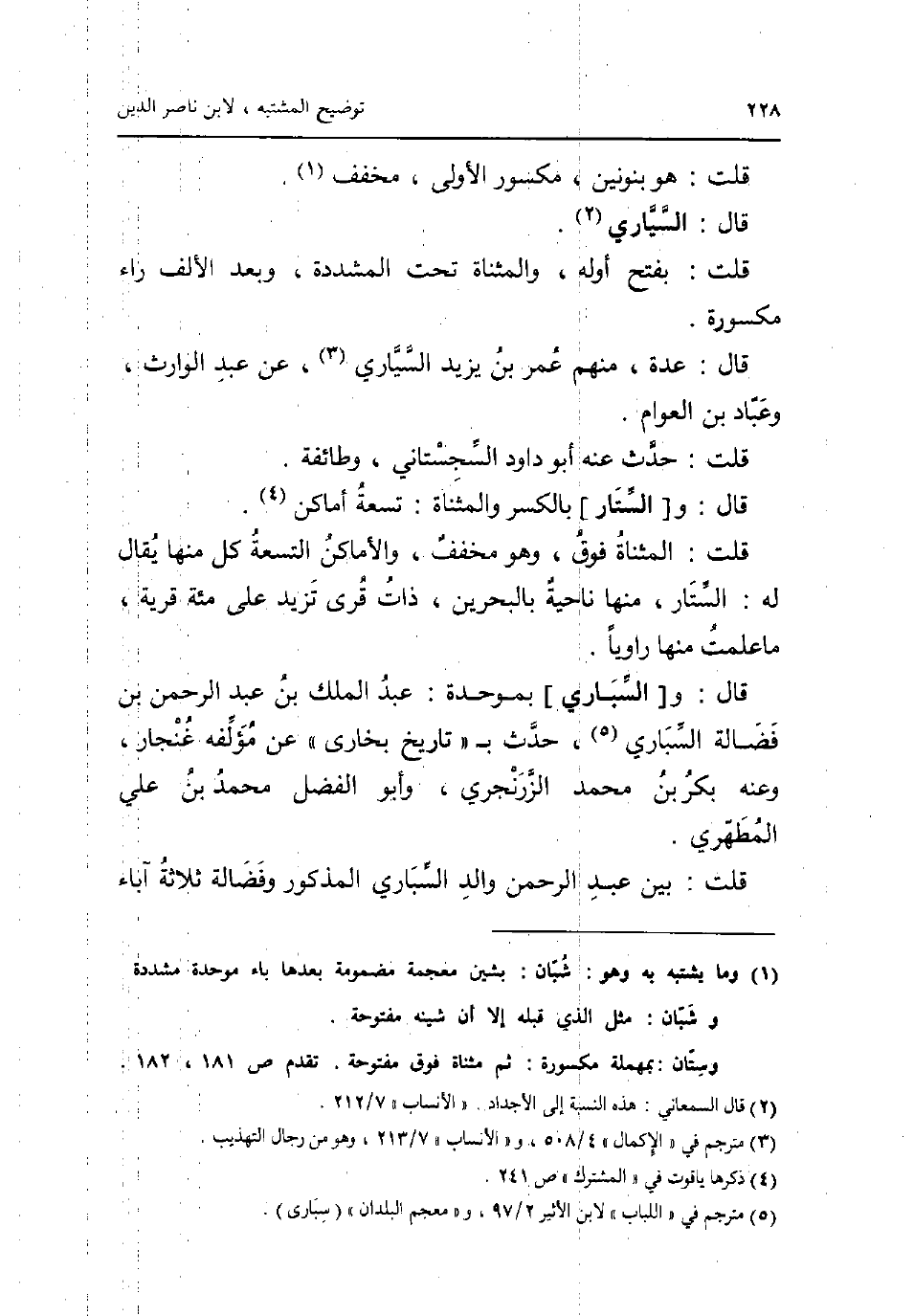 قلت: هُوَ بنونين مكسور الأولى مخفف قَالَ: السياري قلت: بِفَتْح اوله والمثناة تَحت الْمُشَدّدَة وَبعد الْألف رَاء مَكْسُورَة قَالَ: عدَّة مِنْهُم عمر بن يزِيد السياري عَن عبد الْوَارِث وَعباد بن الْعَوام قلت حدث عَنهُ أَبُو دَاوُد السجسْتانِي وَطَائِفَة قَالَ: و [الستار] بِالْكَسْرِ والمثناة: تِسْعَة أَمَاكِن قلت: الْمُثَنَّاة فقو وَهُوَ مخفف والأماكن التِّسْعَة كل مِنْهَا يُقَال لَهُ: الستار مِنْهَا نَاحيَة بِالْبَحْرَيْنِ ذَات قرى تزيد على مئة قَرْيَة مَا علمت مِنْهَا رَاوِيا قَالَ: و [السباري] بموحدة: عبد الْملك بن عبد الرَّحْمَن بن فضَالة السباري حدث ب تَارِيخ بُخَارى عَن مؤلفة غُنْجَار وَعنهُ بكر بن مُحَمَّد الزرنجري وَأَبُو الْفضل مُحَمَّد بن عَليّ المطهري قلت: بَين عبد الرَّحْمَن وَالِد السباري الْمَذْكُور وفضالة ثَلَاثَة آبا