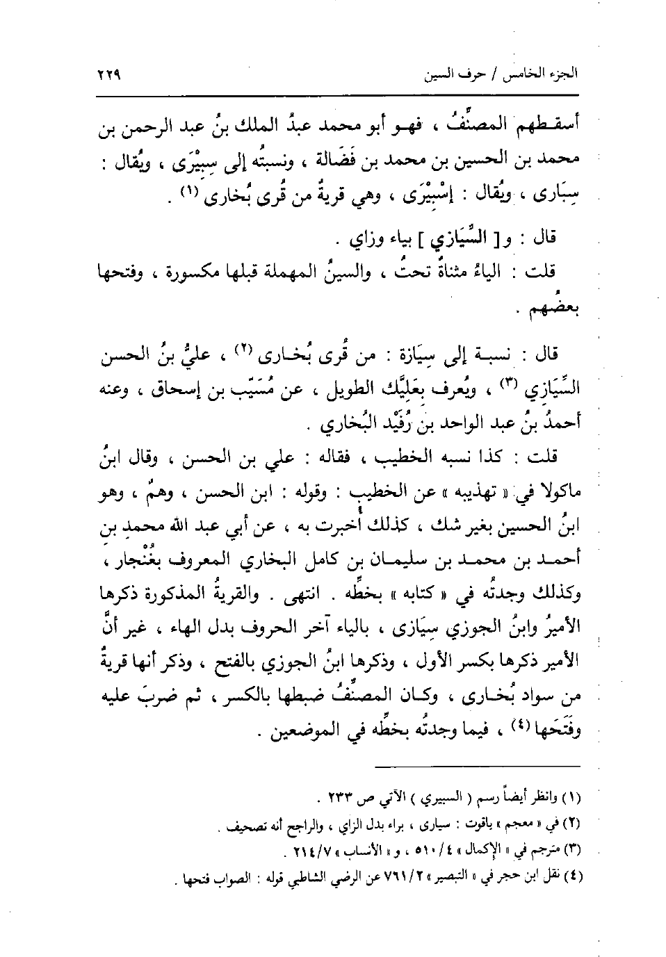 أسقطهم المُصَنّف فَهُوَ أَبُو مُحَمَّد عبد الْملك بن عبد الرَّحْمَن بن مُحَمَّد بن الْحُسَيْن بن مُحَمَّد بن فضَالة ونسبته إِلَى سبيرى وَيُقَال: سبارى وَيُقَال: إسبيرى وَهِي قَرْيَة من قرى بُخَارى قَالَ: و [السيازي] بياء وزاي قلت: الْيَاء مثناة تَحت وَالسِّين الْمُهْملَة قبلهَا مَكْسُورَة وَفتحهَا بَعضهم قَالَ نِسْبَة إِلَى سيازة: من قرى بُخَارى عَليّ بن الْحسن السيازي وَيعرف بعليك الطَّوِيل عَن مسيب بن اسحاق وَعنهُ أَحْمد بن عبد الْوَاحِد بن رفيد البُخَارِيّ قلت: كَذَا نسبه الْخَطِيب فقاله: عَليّ بن الْحسن وَقَالَ ابْن مَاكُولَا فِي تهذيبه عَن الْخَطِيب: وَقَوله: ابْن الْحسن وهم وَهُوَ أَحْمد بن مُحَمَّد سُلَيْمَان بنن كَامِل البُخَارِيّ الْمَعْرُوف بغنجار وَكَذَلِكَ وجدته فِي كِتَابه بِخَطِّهِ انْتهى والقرية الْمَذْكُورَة ذكرهَا الْأَمِير ذكرهَا بِكَسْر الأول وَذكرهَا ابْن الْجَوْزِيّ بِالْفَتْح وَذكر انها قَرْيَة من سَواد بُخَارى وَكَانَ المُصَنّف ضَبطهَا بِالْكَسْرِ ثمَّ ضرب عَلَيْهِ وَفتحهَا فِيمَا وجدته بِخَطِّهِ فِي الْمَوْضِعَيْنِ.