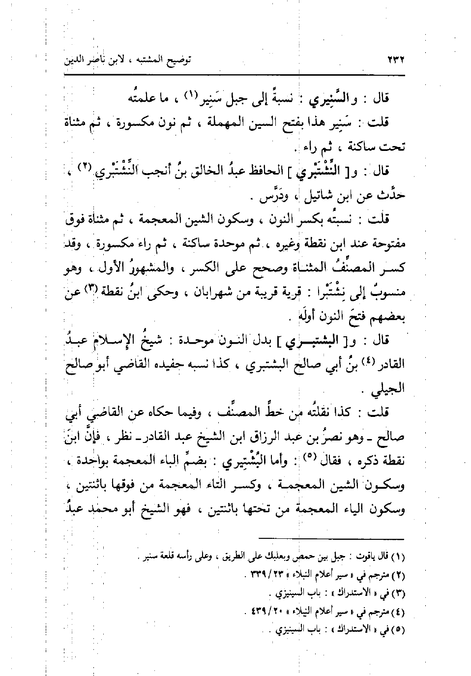 قَالَ: والسنيري: نِسْبَة إِلَى جبل سنير مَا عَلمته قلت: سنير هَذَا بِفَتْح السِّين الْمُهْملَة ثمَّ نون مَكْسُورَة ثمَّ مثناة تَحت سَاكِنة ثمَّ رَاء قَالَ: و [النشتتبري] الْحَافِظ عبد الْخَالِق بن انجب النشتبري حدث عَن ابْن شاتيل ودرس قلت: نسبته بِكَسْر النو وَسُكُون الشين الْمُعْجَمَة ثمَّ مثناة فَوق مَفْتُوحَة عِنْد نقطة وَغَيره ثمَّ مُوَحدَة سَاكِنة ثمَّ رَاء مَكْسُورَة وَقد كسر المُصَنّف الْمُثَنَّاة وَصحح على الْكسر وَالْمَشْهُور الأول وَهُوَ مَنْسُوب إِلَى نشتبرا: قَرْيَة قريبَة من شهرابان وَحكى ابْن نقطة عَن بَعضهم فتح النُّون أَوله قَالَ: و [البشتبري] بدل النُّون مُوَحدَة: شيخ الْإِسْلَام عبد الْقَادِر بن أبي صَالح البشتبري كَذَا نسبه حفيده القَاضِي أَبُو صَالح الجيلي قلت: كَذَا نقلته من خطّ المُصَنّف وَفِيمَا حَكَاهُ عَن القَاضِي أبي صَالح - وَهُوَ نصر بن عبد الرَّزَّاق ابْن الشَّيْخ عبد الْقَادِر - نظر فَإِن ابْن نقطة ذكره فَقَالَ: وَأما البشتيري: بِضَم الْبَاء الْمُعْجَمَة من فَوْقهَا بِاثْنَتَيْنِ وَسُكُون الْيَاء الْمُعْجَمَة من تحتهَا بِاثْنَتَيْنِ فَهُوَ الشَّيْخ أَبُو مُحَمَّد عبد