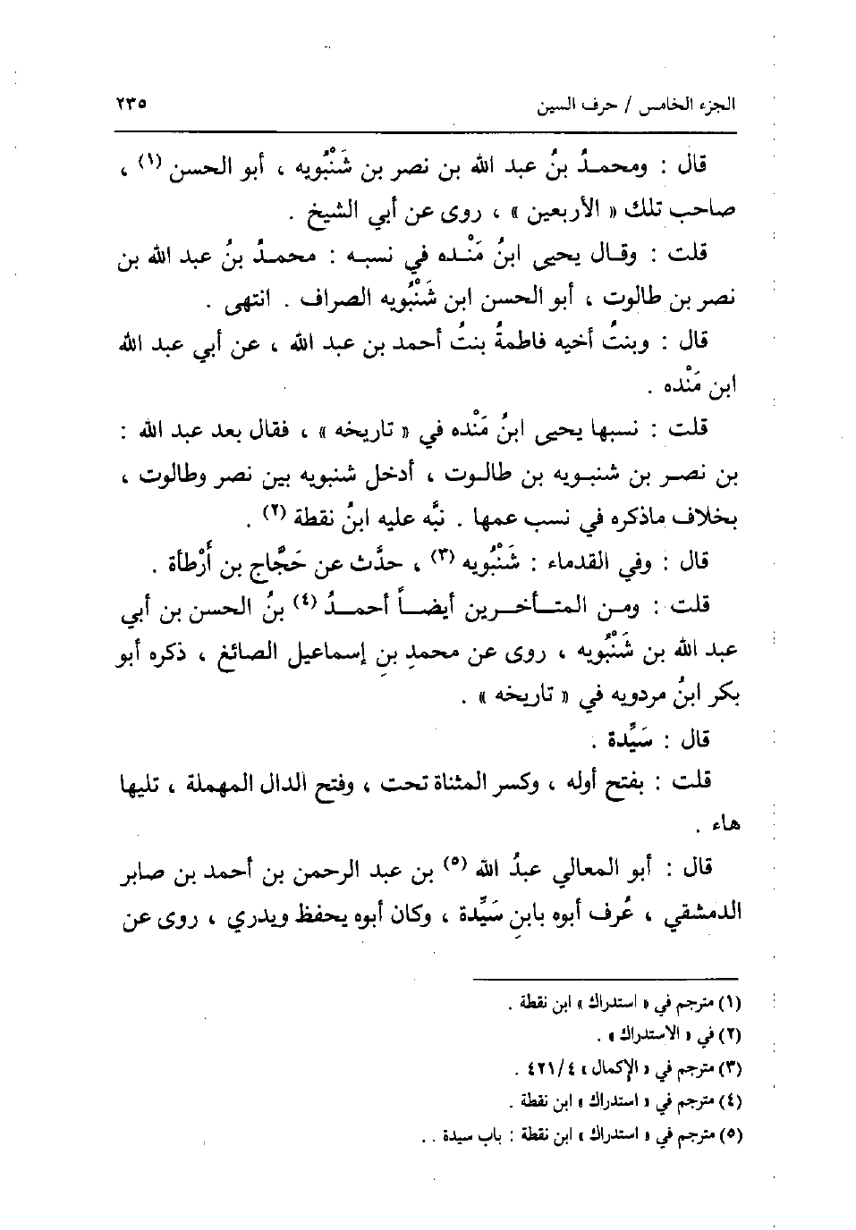 قَالَ: وَمُحَمّد بن عبد الله بن نصر بن شنبويه أَبُو الْحسن صَاحب تِلْكَ الْأَرْبَعين روى عَن أبي الشَّيْخ. قلت: وَقَالَ يحيى ابْن مَنْدَه فِي نسبه: مُحَمَّد بن عبد الله بن نصر بن طالوت أَبُو الْحسن ابْن شنبويه الصراف. انْتهى. قَالَ: وَبنت أَخِيه فَاطِمَة بنت أَحْمد بن عبد الله عَن أبي عبد الله ابْن مَنْدَه. قلت: نَسَبهَا يحيى بن مَنْدَه فِي تَارِيخه فَقَالَ بعد عبد الله: بن نصر بن شنبويه بن طالوت ادخل شنبويه بَين نصر وطالوت بِخِلَاف مَا ذكره فِي نسب عَمها. نبه عَلَيْهِ ابْن نقطة. قَالَ: وَفِي القدماء: شنبويه حدث عَن حجاج بن أَرْطَأَة. قلت: وَمن الْمُتَأَخِّرين أَيْضا أَحْمد بن الْحسن بن أبي عبد الله بن شنبويه روى عَن مُحَمَّد بن إِسْمَاعِيل الصَّائِغ ذكره أَبُو بكر ابْن مرْدَوَيْه فِي تَارِيخه. قَالَ: سيدة. قلت: بِفَتْح اوله وَكسر الْمُثَنَّاة تَحت وَفتح الدَّال الْمُهْملَة تَلِيهَا هَاء. قَالَ: أَبُو الْمَعَالِي عبد الله بن عبد الرَّحْمَن بن أَحْمد بن صابر الدِّمَشْقِي عرف أَبوهُ بِابْن سيدة وَكَانَ أَبوهُ يحفظ ويدري روى عَن