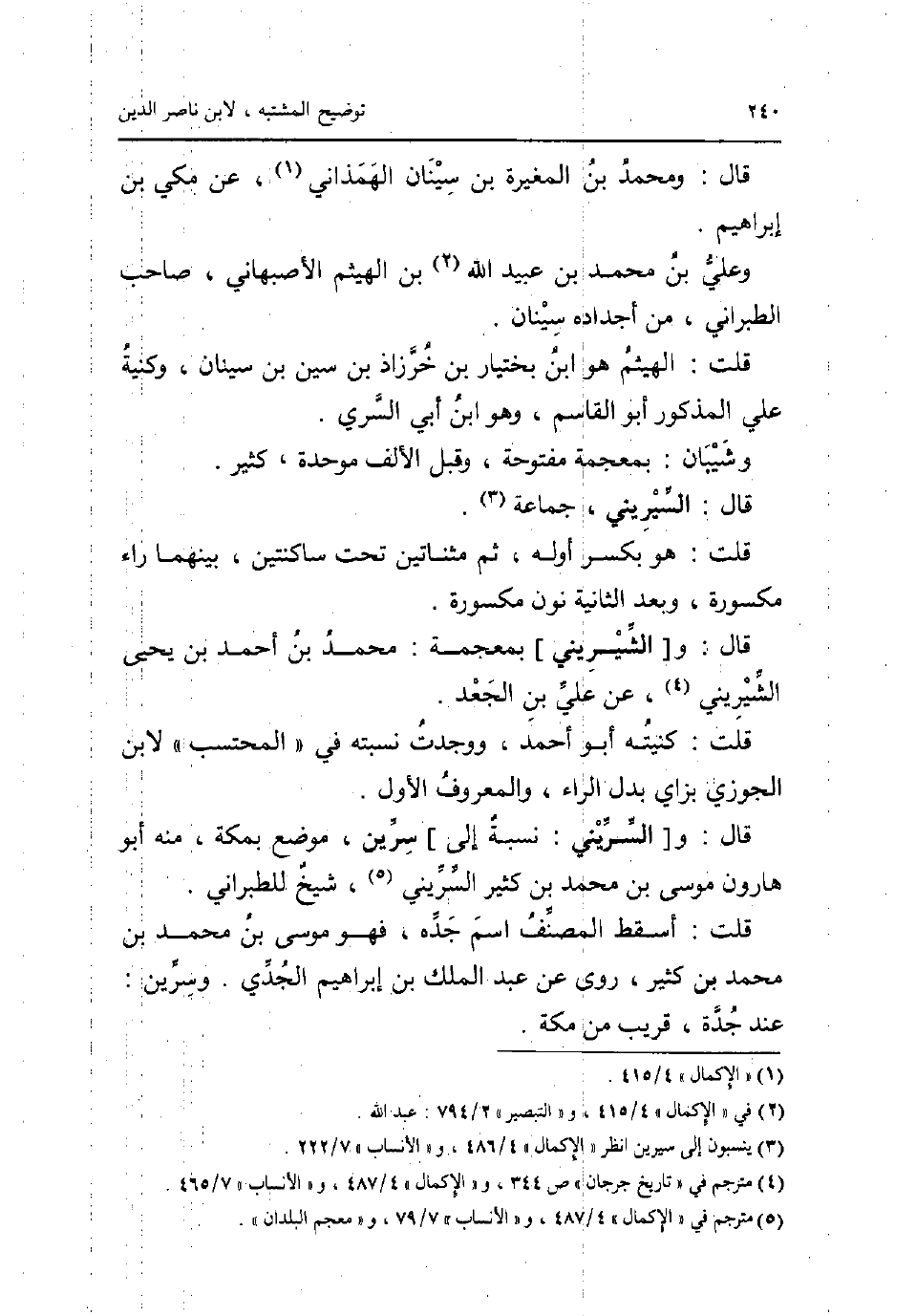 قَالَ: وَمُحَمّد بن الْمُغيرَة بن سينان الهمذاني عَن مكي بن إِبْرَاهِيم. وَعلي بن مُحَمَّد بن عبيد الله بن الْهَيْثَم الاصبهاني صَاحب الطَّبَرَانِيّ من أجداده سينان. قلت: الْهَيْثَم هُوَ ابْن بختيار بن خرزاذ بن سين بن سينان وكنية عَليّ الْمَذْكُور أَبُو الْقَاسِم وَهُوَ ابْن أبي السّري. وشيبان: بِمُعْجَمَة مَفْتُوحَة وَقبل الْألف مُوَحدَة كثير. قَالَ: السيريني جمَاعَة. قلت: هُوَ بِكَسْر اوله ثمَّ مثناتين تَحت ساكنتين بَينهمَا رَاء مَكْسُورَة وَبعد الثَّانِيَة نون مَكْسُورَة. قَالَ: و [الشيريني] بِمُعْجَمَة: مُحَمَّد بن أَحْمد بن يحيى الشيريني عَن عَليّ بن الْجَعْد. قلت: كنيته أَبُو احْمَد وَوجدت نسبته فِي الْمُحْتَسب لِابْنِ الْجَوْزِيّ بزاي بدل الرَّاء وَالْمَعْرُوف الأول. قَالَ و: [السريني: نِسْبَة إِلَى] سِرين مَوضِع بِمَكَّة مِنْهُ أَبُو هَارُون مُوسَى بن مُحَمَّد بن كثير السريني شيخ للطبراني قلت: اسقط المُصَنّف اسْم جده فَهُوَ مُوسَى بن مُحَمَّد بن مُحَمَّد بن كثير روى عَن عبد الْملك بن إِبْرَاهِيم الجدي. وسرين: عِنْد جدة قريب من مَكَّة.