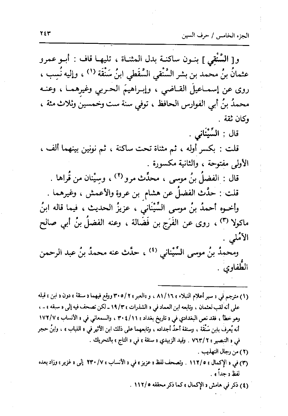 و [السنقي] بنُون سَاكِنة بدل الْمُثَنَّاة تَلِيهَا قَاف: أَبُو عَمْرو عُثْمَان بن مُحَمَّد بن بشر السنقي السَّقطِي ابْن سنقة وَإِلَيْهِ نسب روى عَن إِسْمَاعِيل القَاضِي وَإِبْرَاهِيم الْحَرْبِيّ وَغَيرهمَا وَعنهُ مُحَمَّد بن أبي الفوارس الْحَافِظ توفّي سنة سِتّ وَخمسين وَثَلَاث مئة وَكَانَ ثِقَة. قَالَ: السينَانِي. قلت: بِكَسْر اوله ثمَّ مثناة تَحت سَاكِنة ثمَّ نونين بَينهَا ألف الأولى مَفْتُوحَة وَالثَّانيَِة مَكْسُورَة. قَالَ: الْفضل بن مُوسَى مُحدث مرو وسينان من قراها. قلت: حدث الْفضل عَن هِشَام بن عُرْوَة والاعمش وَغَيرهمَا. وَأَخُوهُ أَحْمد بن مُوسَى السينَانِي عَزِيز الحَدِيث فِيمَا قَالَه ابْن مَاكُولَا روى عَن الْفرج بن فضَالة وَعنهُ الْفضل بن أبي صَالح الآملي. وَمُحَمّد بن مُوسَى السينَانِي حدث عَنهُ مُحَمَّد بن عبد الرَّحْمَن الطفَاوِي.