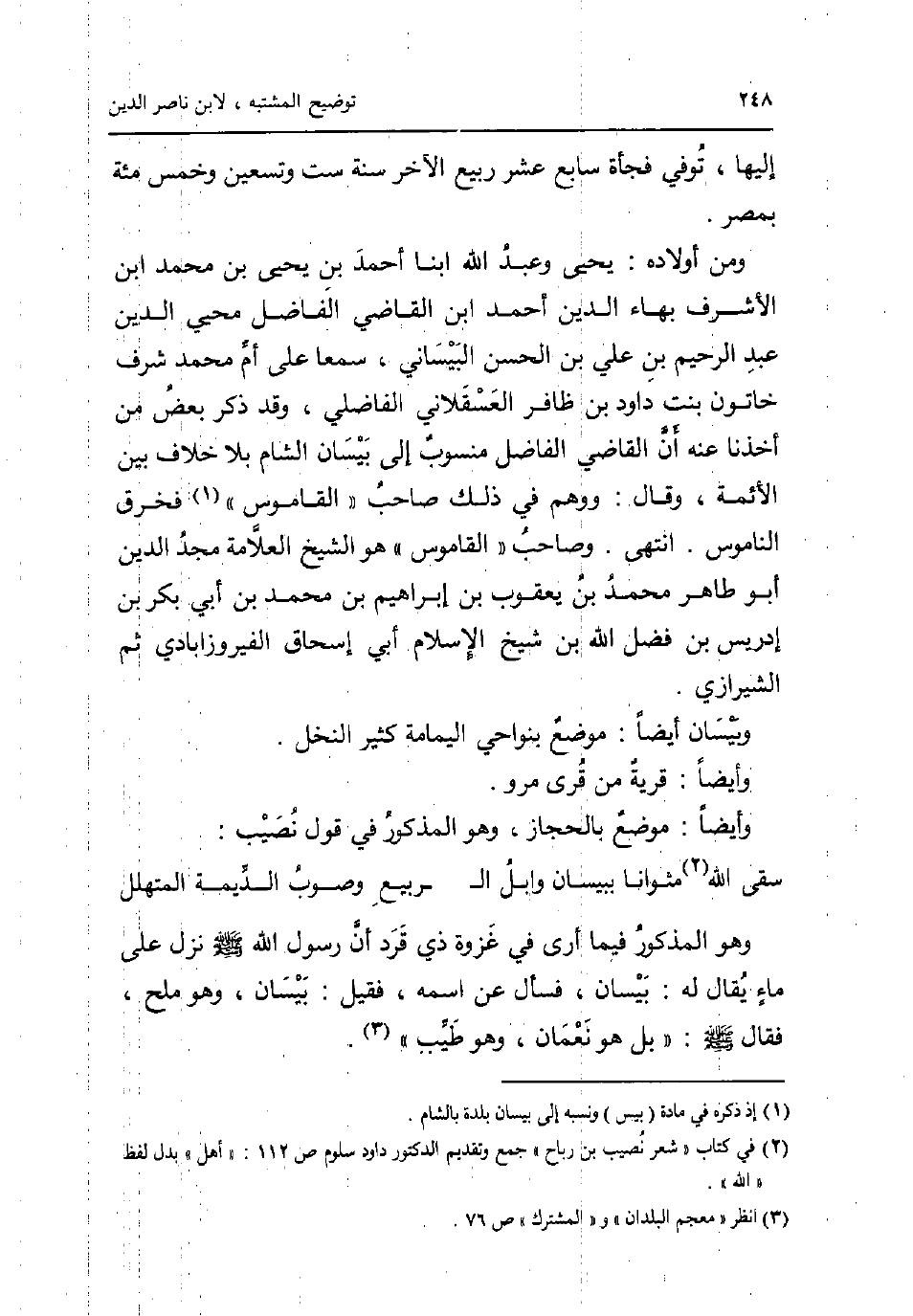 إِلَيْهَا توفّي فَجْأَة سَابِع عشر ربيع الآخر سنة سِتّ وَتِسْعين وَخمْس مئة بِمصْر. وَمن أَوْلَاده: يحيى وَعبد الله ابْنا أَحْمد بن يحيى بن مُحَمَّد ابْن الْأَشْرَف بهاء الدّين أَحْمد ابْن القَاضِي الْفَاضِل محيي الدّين عبد الرَّحِيم بن عَليّ بن الْحسن البيساني سمعا على أم مُحَمَّد شرف خاتون بنت دَاوُد بن ظافر الْعَسْقَلَانِي الفاضلي وَقد ذكر بعض من أَخذنَا عَنهُ أَن القَاضِي الْفَاضِل مَنْسُوب إِلَى بيسان الشَّام بِلَا خلاف بَين الْأَئِمَّة وَقَالَ: وَوهم فِي ذَلِك صَاحب الْقَامُوس فخرق الناموس. انْتهى. وَصَاحب الْقَامُوس هُوَ الشَّيْخ الْعَلامَة مجد الدّين أَبُو طَاهِر مُحَمَّد بن يَعْقُوب بن إِبْرَاهِيم بن مُحَمَّد بن أبي بكر بن إِدْرِيس بن فضل الله بن شيخ الْإِسْلَام أبي إِسْحَاق الفيروزابادي ثمَّ الشِّيرَازِيّ. وبيسان أَيْضا: مَوضِع بنواحي الْيَمَامَة كثير النّخل. وَأَيْضًا: قَرْيَة من قرى مرو. وَأَيْضًا: مَوضِع بالحجاز وَهُوَ الْمَذْكُور فِي قَول نصيب: