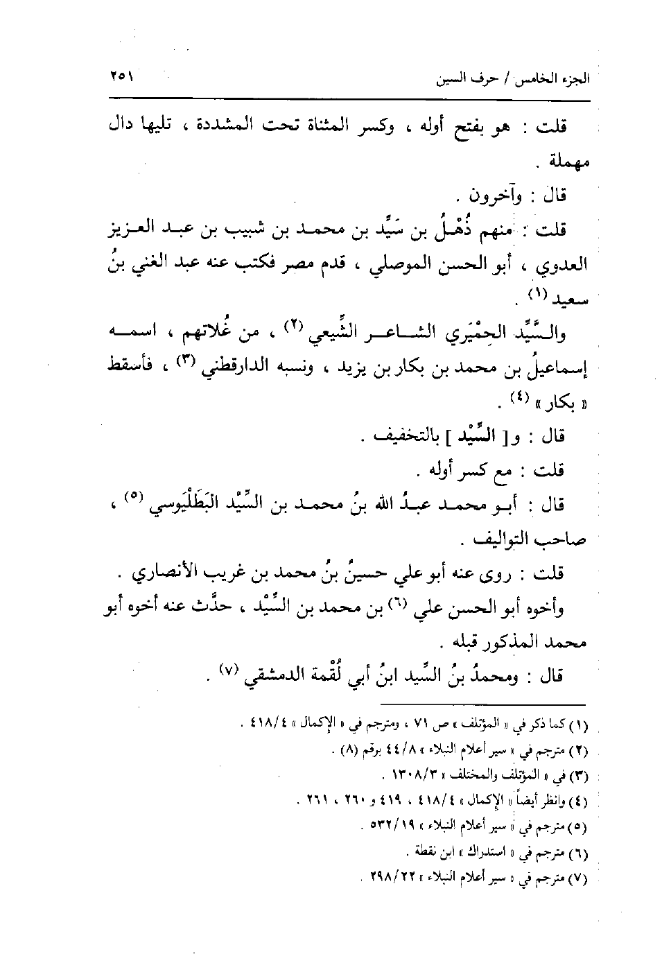 قلت: هُوَ بِفَتْح اوله وَكسر الْمُثَنَّاة تَحت الْمُشَدّدَة تَلِيهَا دَال مُهْملَة. قَالَ: وَآخَرُونَ. قلت: مِنْهُم ذهل بن سيد بن مُحَمَّد بن شبيب بن عبد الْعَزِيز الْعَدوي أَبُو الْحسن الْموصِلِي قدم مصر فَكتب عَنهُ عبد الْغَنِيّ بن سعيد. وَالسَّيِّد الْحِمْيَرِي الشَّاعِر الشيعي من غلاتهم اسْمه إِسْمَاعِيل بن مُحَمَّد بن بكار بن يزِيد وَنسبه الدَّارَقُطْنِيّ فأسقط بكار. قَالَ: و [السَّيِّد] بِالتَّخْفِيفِ. قلت: مَعَ كسر أَوله. قَالَ أَبُو مُحَمَّد عبد الله بن مُحَمَّد بن السَّيِّد البطليوسي صَاحب التواليف. قلت: روى عَنهُ أَبُو عَليّ حُسَيْن بن مُحَمَّد بن غَرِيب الْأنْصَارِيّ. واخوه أَبُو الْحسن عَليّ بن مُحَمَّد بن السَّيِّد حدث عَنهُ اخوه أَبُو مُحَمَّد الْمَذْكُور قبله. قَالَ: وَمُحَمّد بن السَّيِّد ابْن أبي لقْمَة الدِّمَشْقِي.