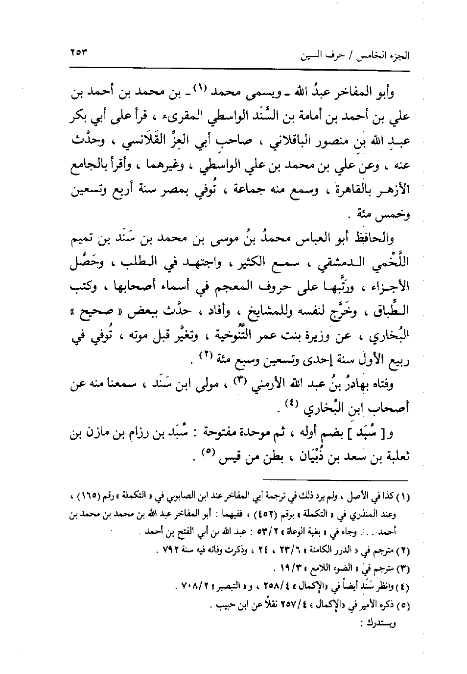 وَأَبُو المفاخر عبد الله - وَيُسمى مُحَمَّد - بن مُحَمَّد بن أَحْمد بن عَليّ بن أَحْمد بن امامة بن السَّنَد الوَاسِطِيّ الْمُقْرِئ قَرَأَ عَليّ أبي بكر عبد الله بن مَنْصُور الباقلاني صَاحب أبي الْعِزّ القلانسي وَحدث عَنهُ وَعَن عَليّ بن مُحَمَّد بن عَليّ الوَاسِطِيّ وَغَيرهمَا واقرا بالجامع الازهر بِالْقَاهِرَةِ وَسمع مِنْهُ جمَاعَة توفّي بِمصْر سنة أَربع وَتِسْعين وَخمْس مئة. والحافظ أَبُو الْعَبَّاس مُحَمَّد بن مُوسَى بن مُحَمَّد بن سَنَد بن تَمِيم اللَّخْمِيّ الدِّمَشْقِي سمع الْكثير واجتهد فِي الطّلب وَحصل الاجزاء ورتبها على حُرُوف المعجم فِي أَسمَاء اصحابها وَكتب الطباق وَخرج لنَفسِهِ وللمشايخ وافاد حدث بِبَعْض صَحِيح البُخَارِيّ عَن وزيرة بنت عمر التنوخية وَتغَير قبل مَوته توفّي فِي ربيع الأول سنة إِحْدَى وَتِسْعين وَسبع مئة. وفتاه بهادر بن عبد الله الارمني مولى ابْن سَنَد سمعنَا مِنْهُ عَن أَصْحَاب ابْن البُخَارِيّ. و [سبد] بِضَم اوله ثمَّ مُوَحدَة مَفْتُوحَة: سبد بن رزام بن مَازِن بن ثَعْلَبَة بن سعد بن ذبيان بطن من قيس.
