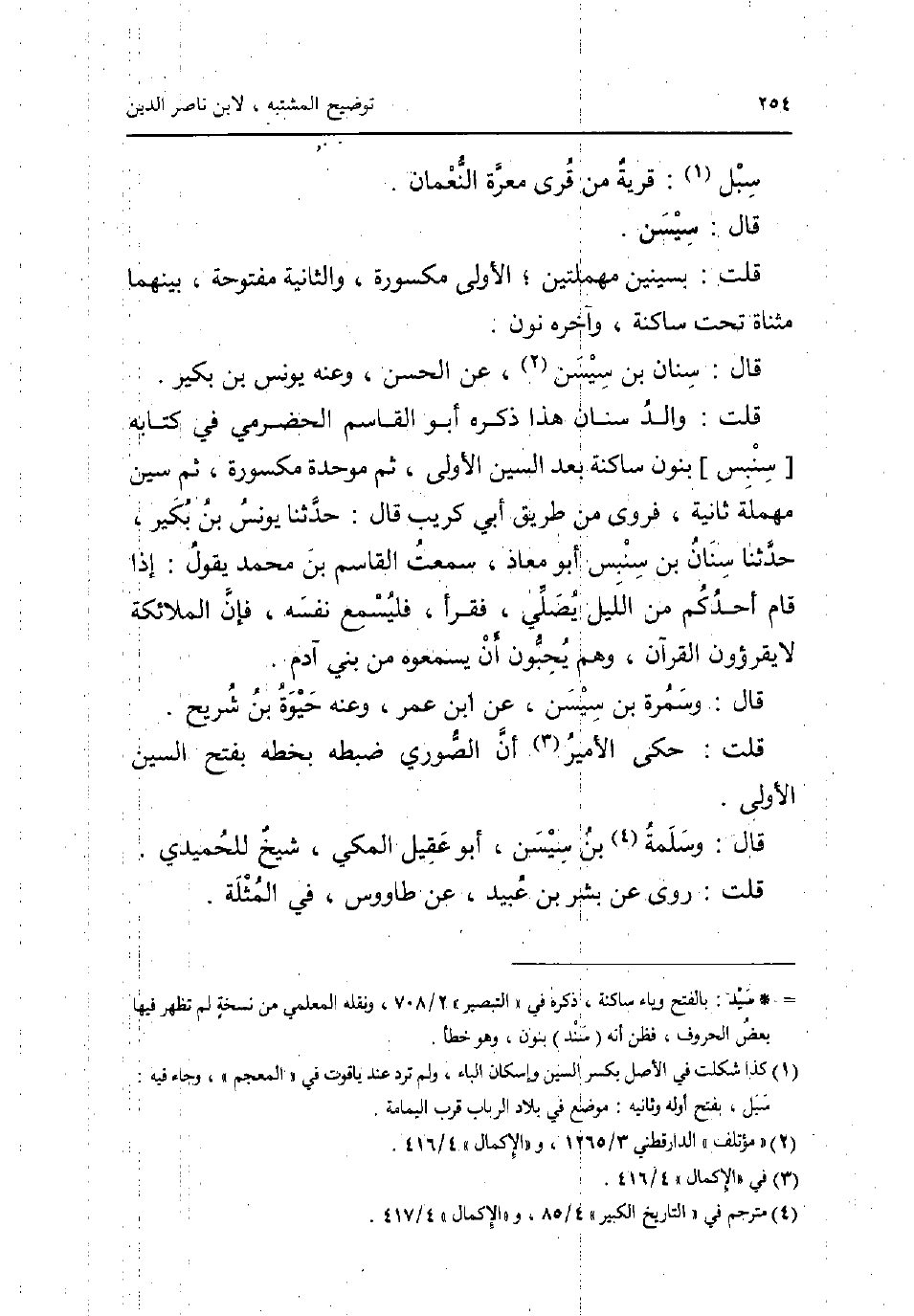 سبل: قَرْيَة من قرى معرة النُّعْمَان. قَالَ: سيسن. قلت: بسينين مهملتين الأولى مَكْسُورَة وَالثَّانيَِة مَفْتُوحَة بَينهمَا مثناة تَحت سَاكِنة وَآخره نون. قَالَ: سِنَان بن سيسن عَن الْحسن وَعنهُ يُونُس بن بكير. قلت: وَالِد سِنَان هَذَا ذكره أَبُو الْقَاسِم الْحَضْرَمِيّ فِي كِتَابه [سِنْبِسٍ] بنُون سَاكِنة بعد السِّين الأولى ثمَّ مُوَحدَة مَكْسُورَة ثمَّ سين مُهْملَة ثَانِيَة فروى من طَرِيق أبي كريب قَالَ: حَدثنَا يُونُس بن بكير حَدثنَا سِنَان بن سِنْبِسٍ أَبُو معَاذ سَمِعت الْقَاسِم بن مُحَمَّد يَقُول: إِذا قَامَ أحدكُم من اللَّيْل يُصَلِّي فَقَرَأَ فليسمع نَفسه فَإِن الْمَلَائِكَة لَا يقرؤون الْقُرْآن وهم يحبونَ أَن يسمعوه من بني آدم. قَالَ: وَسمرَة بن سيسن عَن ابْن عمر وَعنهُ حَيْوَة بن شُرَيْح. قلت: حكى الْأَمِير أَن الصُّورِي ضَبطه بِخَطِّهِ بِفَتْح السِّين الأولى. قَالَ: وَسَلَمَة بن سيسن أَبُو عقيل الْمَكِّيّ شيخ للحميدي. قلت: روى عَن بشر بن عبيد عَن طَاوُوس فِي الْمثلَة.