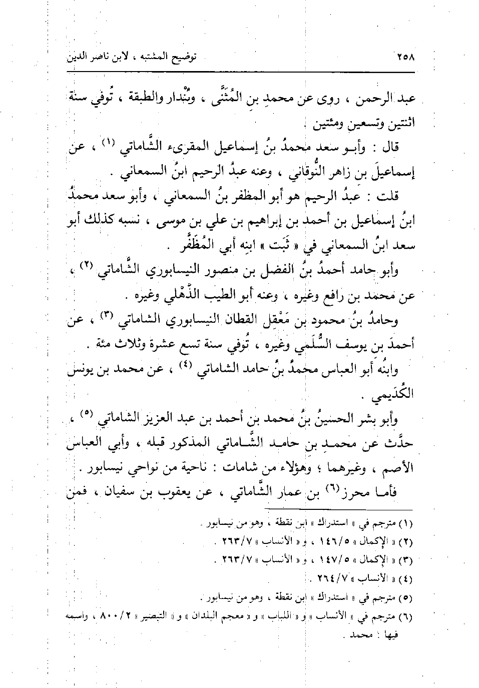 عبد الرَّحْمَن روى عَن مُحَمَّد بن الْمثنى وَبُنْدَار والطبقة توفّي سنة اثْنَتَيْنِ وَتِسْعين ومئتين. قَالَ: وَأَبُو سعد مُحَمَّد بن إِسْمَاعِيل الْمقري الشاماتي عَن إِسْمَاعِيل بن زَاهِر النوقاني وَعنهُ عبد الرَّحِيم ابْن السَّمْعَانِيّ. قلت: عبد الرَّحِيم هُوَ أَبُو المظفر بن السَّمْعَانِيّ وَأَبُو سعد مُحَمَّد ابْن إِسْمَاعِيل بن أَحْمد بن إِبْرَاهِيم بن عَليّ بن مُوسَى نسبه كَذَلِك أَبُو سعد ابْن السَّمْعَانِيّ فِي ثَبت ابْنه أبي المظفر. وَأَبُو حَامِد أَحْمد بن الْفضل بن مَنْصُور النَّيْسَابُورِي الشاماتي عَن مُحَمَّد بن رَافع وَغَيره وَعنهُ أَبُو الطّيب الذهلي وَغَيره. وحامد بن مَحْمُود بن معقل الْقطَّان النَّيْسَابُورِي الشاماتي عَن أَحْمد بن يُوسُف السّلمِيّ وَغَيره توفّي سنة تسع عشرَة وَثَلَاث مئة. وَابْنه أَبُو الْعَبَّاس مُحَمَّد بن حَامِد الشاماتي عَن مُحَمَّد بن يُونُس الْكُدَيْمِي. وَأَبُو بشر الْحُسَيْن بن مُحَمَّد بن أَحْمد بن عبد الْعَزِيز الشاماتي حدث عَن مُحَمَّد بن حَامِد الشاماتي الْمَذْكُور قبله وابي الْعَبَّاس الاصم وَغَيرهمَا وَهَؤُلَاء من شامات: نَاحيَة من نواحي نيسابور. فَأَما مُحرز بن عمار الشاماتي عَن يَعْقُوب بن سُفْيَان فَمن