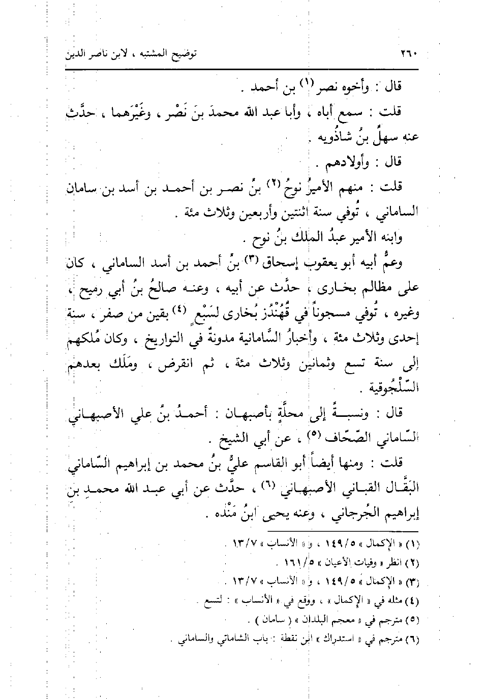 قَالَ: واخوه نصر بن أَحْمد. قلت: سمع اباه وابا عبد الله مُحَمَّد بن نصر وَغَيرهمَا حدث عَنهُ سهل بن شاذويه. قَالَ: وَأَوْلَادهمْ. قلت: مِنْهُم الْأَمِير نوح بن نصر بن أَحْمد بن أَسد بن سامان الساماني توفّي سنة اثْنَتَيْنِ واربعين وَثَلَاث مئة. وإبنه الْأَمِير عبد الْملك بن نوح. وَعم أَبِيه أَبُو يَعْقُوب إِسْحَاق بن أَحْمد بن أَسد الساماني كَانَ على مظالم بُخَارى حدث عَن ابيه وَعنهُ صَالح بن أبي رُمَيْح وَغَيره توفّي مسجونا فِي قهندز بُخَارى لسبع بَقينَ من صفر سنة إِحْدَى وَثَلَاث مئة واخبار السامانية مدونة فِي التواريخ وَكَانَ ملكهم إِلَى سنة تسع وَثَمَانِينَ وَثَلَاث مئة ثمَّ انقرض وَملك بعدهمْ السلجوقية. قَالَ: وَنسبَة إِلَى محلّة بأصبهان: أَحْمد بن عَليّ الاصبهاني الساماني الصحاف عَن أبي الشَّيْخ. قلت: وَمِنْهَا أَيْضا أَبُو الْقَاسِم عَليّ بن مُحَمَّد بن إِبْرَاهِيم الساماني الْبَقَّال القباني الاصبهاني حدث عَن أبي عبد الله مُحَمَّد بن إِبْرَاهِيم الْجِرْجَانِيّ وَعنهُ يحيى ابْن مَنْدَه.