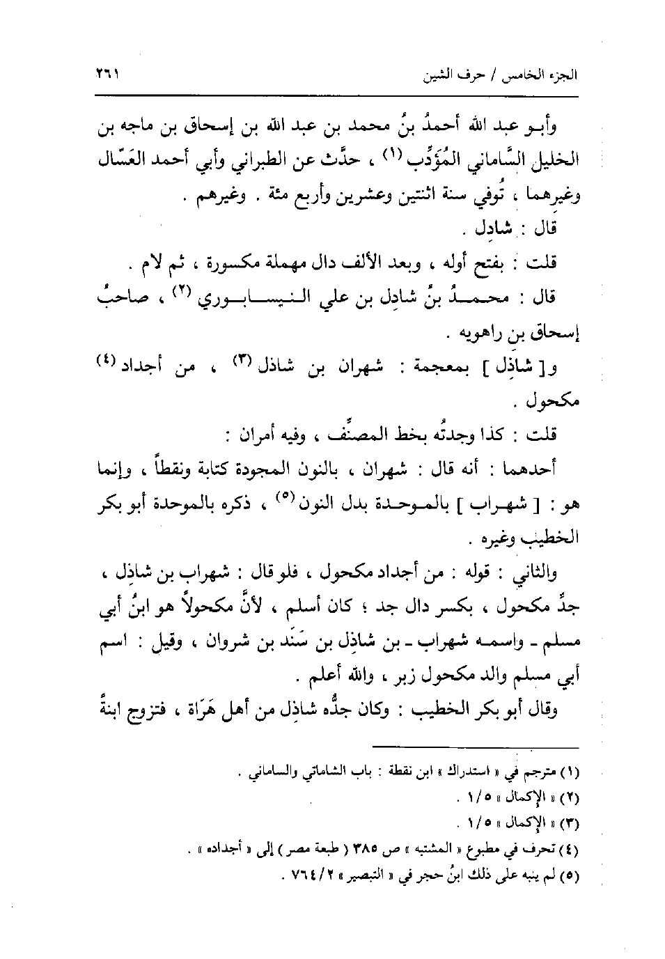 وَأَبُو عبد الله أَحْمد بن مُحَمَّد بن عبد الله بن إِسْحَاق بن مَاجَه بن الْخَلِيل الساماني الْمُؤَدب حدث عَن الطَّبَرَانِيّ وابي أَحْمد الْعَسَّال وَغَيرهمَا توفّي سنة اثْنَتَيْنِ وَعشْرين وَأَرْبع مئة. وَغَيرهم قَالَ: شادل. قلت: بِفَتْح أَوله وَبعد الالف دَال مُهْملَة مَكْسُورَة ثمَّ لَام. قَالَ: مُحَمَّد بن شادل بن عَليّ النَّيْسَابُورِي صَاحب إِسْحَاق بن رَاهْوَيْةِ. و [شاذل] بِمُعْجَمَة: شَهْرَان بن شاذل من اجداد مَكْحُول. قلت: كَذَا وجدته بِخَط المُصَنّف وَفِيه امران: أَحدهمَا: انه قَالَ: شَهْرَان بالنُّون المجودة كِتَابَة ونقطا وَإِنَّمَا هُوَ: [شهراب] بِالْمُوَحَّدَةِ بدل النُّون ذكره بِالْمُوَحَّدَةِ أَبُو بكر الْخَطِيب وَغَيره. وَالثَّانِي: قَوْله: من اجداد مَكْحُول فَلَو قَالَ: شهراب بن شاذل جد مَكْحُول بِكَسْر دَال جد كَانَ اسْلَمْ لِأَن مَكْحُولًا هُوَ ابْن أبي مُسلم - واسْمه شهراب - بن شاذل بن سَنَد بن شرْوَان وَقيل: اسْم أبي مُسلم وَالِد مَكْحُول زبر وَالله اعْلَم. وَقَالَ أَبُو بكر الْخَطِيب: وَكَانَ جده شاذل من أهل هراة فَتزَوج ابْنة