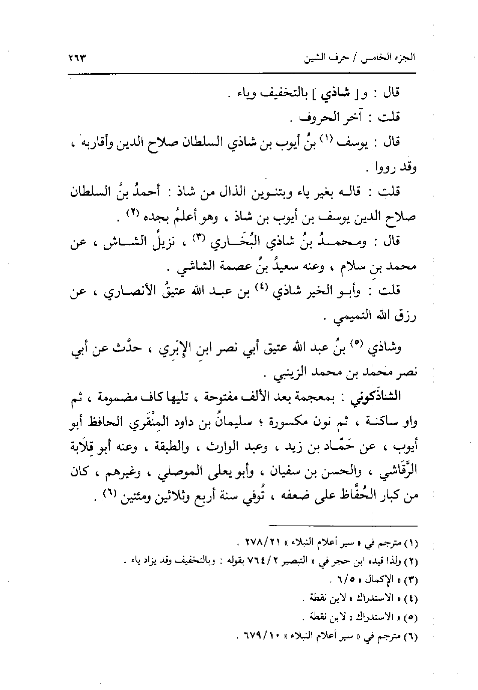 قَالَ: و [شاذي] بِالتَّخْفِيفِ وياء. قلت: آخر الْحُرُوف. قَالَ: يُوسُف بن أَيُّوب بن شاذي السُّلْطَان صَلَاح الدّين واقاربه وَقد رووا. قلت: قَالَه بِغَيْر يَاء وبتنوين الذَّال من شَاذ: أَحْمد بن السُّلْطَان صَلَاح الدّين يُوسُف بن أَيُّوب بن شَاذ وَهُوَ اعْلَم بجده. قَالَ: وَمُحَمّد بن شاذي البُخَارِيّ نزيل الشاش عَن مُحَمَّد بن سَلام وَعنهُ سعيد بن عصمَة الشَّاشِي. قلت: وَأَبُو الْخَيْر شاذي بن عبد الله عَتيق الانصاري عَن رزق الله التَّمِيمِي. وشاذي بن عبد الله عَتيق أبي نصر ابْن الابري حدث عَن أبي نصر مُحَمَّد بن مُحَمَّد الزَّيْنَبِي. الشَّاذكُونِي: بِمُعْجَمَة بعد الالف مَفْتُوحَة تَلِيهَا كَاف مَضْمُومَة ثمَّ وَاو سَاكِنة ثمَّ نون مَكْسُورَة سُلَيْمَان بن دَاوُد الْمنْقري الْحَافِظ أَبُو أَيُّوب عَن حَمَّاد بن زيد وَعبد الْوَارِث والطبقة وَعنهُ أَبُو قلَابَة الرقاشِي وَالْحسن بن سُفْيَان وَأَبُو يعلى الْموصِلِي وَغَيرهم كَانَ من كبار الْحفاظ على ضعفه توفّي سنة أَربع وَثَلَاثِينَ ومئتين.