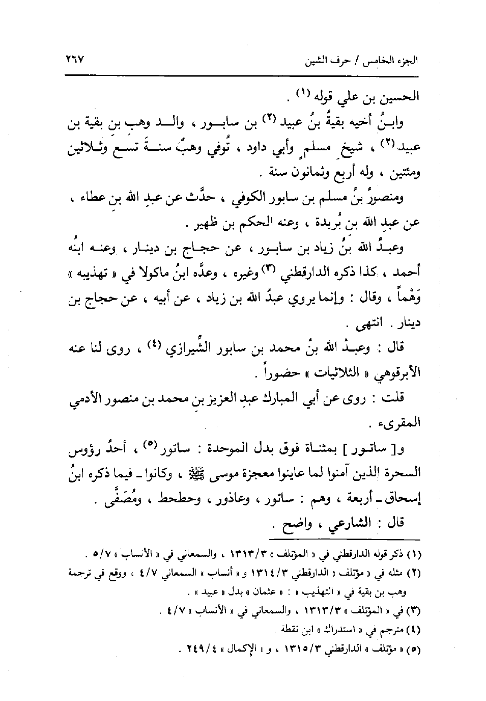 الْحُسَيْن بن عَليّ قَوْله. وَابْن أَخِيه بَقِيَّة بن عبيد بن سَابُور وَالِد وهب بن بَقِيَّة بن عبيد شيخ مُسلم وابي دَاوُد توفّي وهب سنة تسع وَثَلَاثِينَ ومئتين وَله أَربع وَثَمَانُونَ سنة. وَمَنْصُور بن مُسلم بن سَابُور الْكُوفِي حدث عَن عبد الله بن عَطاء عَن عبد الله بن بُرَيْدَة وَعنهُ الحكم بن ظهير. وَعبد الله بن زِيَاد بن سَابُور عَن حجاج بن دِينَار وَعنهُ ابْنه احْمَد كَذَا ذكره الدَّارَقُطْنِيّ وَغَيره وعده ابْن مَاكُولَا فِي تهذيبه وهما وَقَالَ: وَإِنَّمَا يروي عبد الله بن زِيَاد عَن ابيه عَن حجاج بن دِينَار. انْتهى. قَالَ: وَعبد الله بن مُحَمَّد بن سَابُور الشِّيرَازِيّ روى لنا عَنهُ الابرقوهي الثلاثيات حضورا. قلت: روى عَن أبي الْمُبَارك عبد الْعَزِيز بن مُحَمَّد بن مَنْصُور الادمي الْمُقْرِئ. و [ساتور] بمثناة فَوق بدل الْمُوَحدَة: ساتور أحد رُؤُوس السَّحَرَة الَّذين آمنُوا لما عاينوا معْجزَة مُوسَى صلى الله عَلَيْهِ وَسلم وكانو - فِيمَا ذكره ابْن إِسْحَاق - اربعة وهم: ساتور وعاذور وحطحط ومصفى. قَالَ: الشارعي وَاضح.