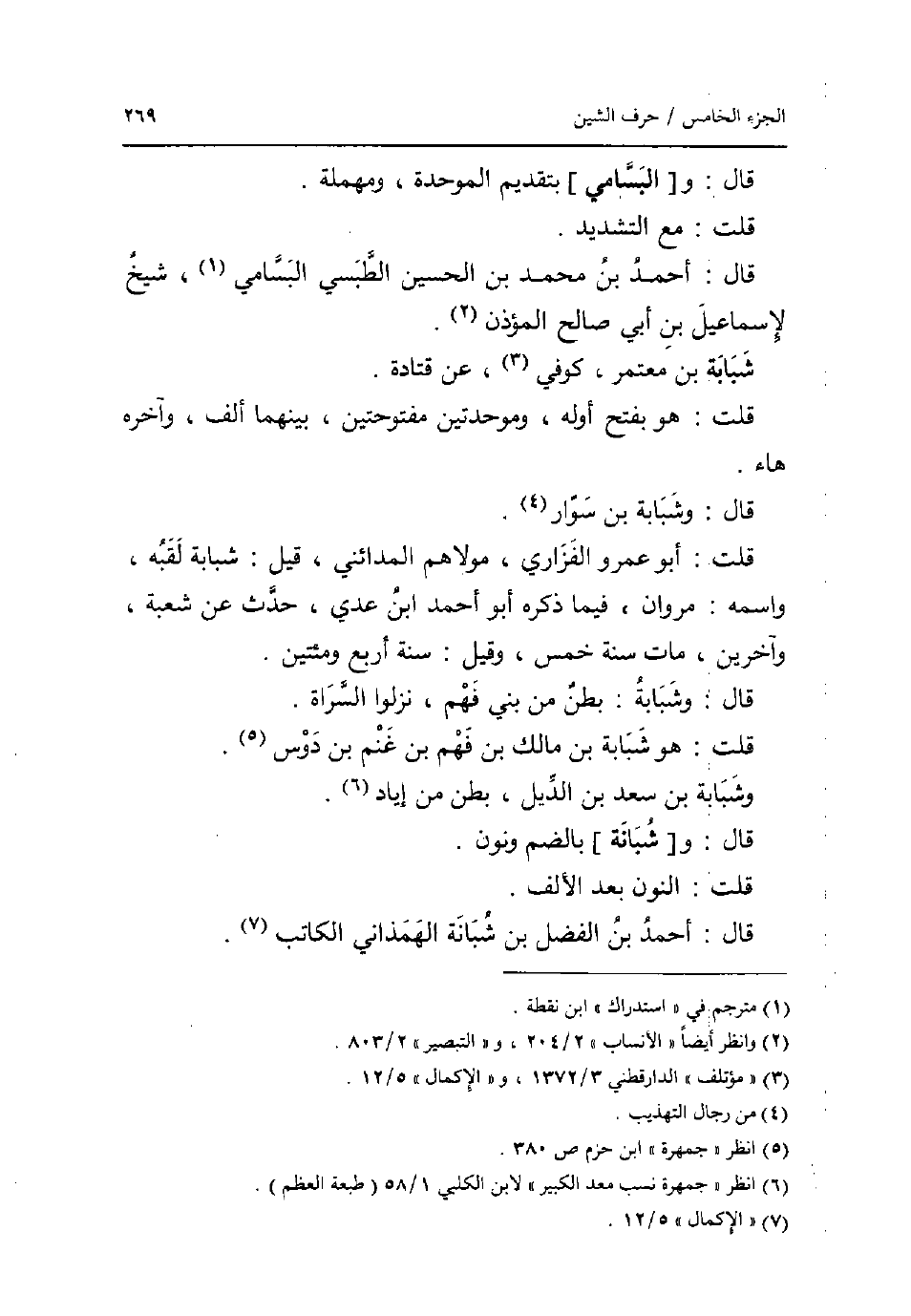 قَالَ: و [البسامي] بِتَقْدِيم الْمُوَحدَة ومهملة. قلت: مَعَ التَّشْدِيد. قَالَ: أَحْمد بن مُحَمَّد بن الْحُسَيْن الطبسي البسامي شيخ لإسماعيل بن أبي صَالح الْمُؤَذّن. شَبابَة بن مُعْتَمر كُوفِي عَن قَتَادَة. قلت: هُوَ بِفَتْح اوله وموحدتين مفتوحتين بَينهمَا الف وَآخره هَاء. قَالَ: وشبابة بن سوار. قلت: أَبُو عَمْرو الْفَزارِيّ مَوْلَاهُم الْمَدَائِنِي قيل شَبابَة لقبه واسْمه: مَرْوَان فِيمَا ذكره أَبُو أَحْمد ابْن عدي حدث عَن شُعْبَة وَآخَرين مَاتَ سنة خمس وَقيل: سنة أَربع ومئتين. قَالَ: وشبابة: بطن من بني فهم نزلُوا السراة. قلت: هُوَ شَبابَة بن مَالك بن فهم بن غنم بن دوس. وشبابة بن سعد بن الديل بطن من إياد. قَالَ: و [شبانة] بِالضَّمِّ وَنون. قلت: النُّون بعد الالف. قَالَ: أَحْمد بن الْفضل بن شبانة الهمذاني الْكَاتِب.