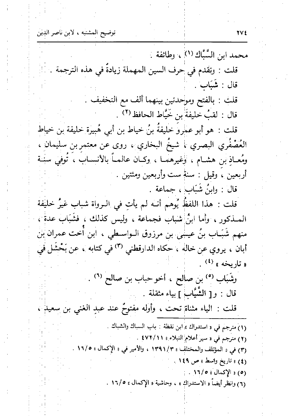 مُحَمَّد ابْن السباك وَطَائِفَة. قلت: وَتقدم فِي حرف السِّين الْمُهْملَة زِيَادَة فِي هَذِه التَّرْجَمَة. قَالَ: شباب. قلت: بِالْفَتْح وموحدتين بَينهمَا ألف مَعَ التَّخْفِيف. قَالَ: لقب خَليفَة بن خياط الْحَافِظ. قلت: هُوَ أَبُو عَمْرو خَليفَة بن خياط بن أبي هُبَيْرَة خَليفَة بن خياط الْعُصْفُرِي الْبَصْرِيّ شيخ البُخَارِيّ روى عَن مُعْتَمر بن سُلَيْمَان ومعاذ بن هِشَام وَغَيرهمَا وَكَانَ عَالما بالانساب توفّي سنة أَرْبَعِينَ وَقيل: سنة سِتّ واربعين ومئتين. قَالَ: وَابْن شباب جمَاعَة. قلت: هَذَا اللَّفْظ يُوهم انه لم يَأْتِ فِي الروَاة شباب غير خَليفَة الْمَذْكُور وَأما ابْن شباب فجماعة وَلَيْسَ كَذَلِك فشباب عدَّة مِنْهُم شباب بن عِيسَى بن مَرْزُوق الوَاسِطِيّ ابْن اخت عمرَان بن ابان يروي عَن خَاله حَكَاهُ الدَّارَقُطْنِيّ فِي كِتَابه عَن بحشل فِي تَارِيخه. وشباب بن صَالح أَخُو حباب بن صَالح. قَالَ: و [الشياب] بياء مثقلة. قلت: الْيَاء مثناة تَحت وأوله مَفْتُوح عِنْد عبد الْغَنِيّ بن سعيد