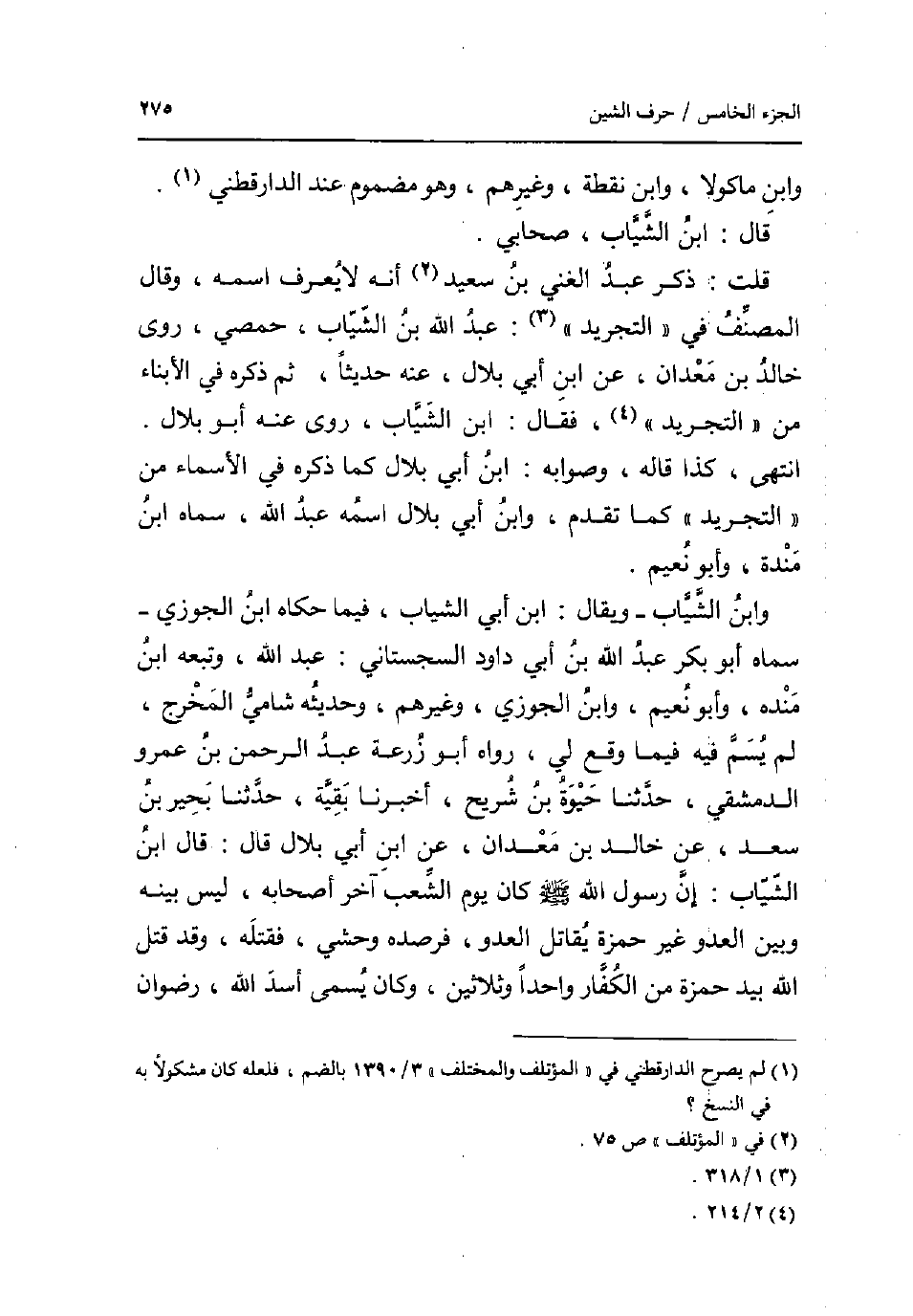 وَابْن مَاكُولَا وَابْن نقطة وَغَيرهم وَهُوَ مضموم عِنْد الدَّارَقُطْنِيّ. قَالَ: ابْن الشياب صَحَابِيّ. قلت: ذكر عبد الْغَنِيّ بن سعيد انه لَا يعرف اسْمه وَقَالَ المُصَنّف فِي التَّجْرِيد: عبد الله بن الشياب حمصي روى خَالِد بن معدان عَن ابْن أبي بِلَال عَنهُ حَدِيثا ثمَّ ذكره فِي الابناء من التَّجْرِيد فَقَالَ: ابْن الشياب روى عَنهُ أَبُو بِلَال. انْتهى كَذَا قَالَه وَصَوَابه: ابْن أبي بِلَال كَمَا ذكره فِي الْأَسْمَاء من التَّجْرِيد كَمَا تقدم وَابْن أبي بِلَال اسْمه عبد الله سَمَّاهُ ابْن مندة وَأَبُو نعيم. وَابْن الشياب - وَيُقَال: ابْن أبي الشياب فِيمَا حَكَاهُ ابْن الْجَوْزِيّ - سَمَّاهُ أَبُو بكر عبد الله بن أبي دَاوُد السجسْتانِي: عبد الله وَتَبعهُ ابْن مَنْدَه وَأَبُو نعيم وَابْن الْجَوْزِيّ وَغَيرهم وَحَدِيثه شَامي الْمخْرج لم يسم فِيهِ فِيمَا وَقع لي رَوَاهُ أَبُو زرْعَة عبد الرَّحْمَن بن عَمْرو الدِّمَشْقِي حَدثنَا حَيْوَة بن شُرَيْح أخبرنَا بَقِيَّة حَدثنَا بحير بن سعد عَن خَالِد بن معدان عَن ابْن أبي بِلَال قَالَ: قَالَ ابْن الشياب: إِن رَسُول الله صلى الله عَلَيْهِ وَسلم كَانَ يَوْم الشّعب آخر اصحابه لَيْسَ بَينه وَبَين الْعَدو غير حَمْزَة يُقَاتل الْعَدو فرصده وَحشِي فَقتله وَقد قتل الله بيد حَمْزَة من الْكفَّار وَاحِدًا وَثَلَاثِينَ وَكَانَ يُسمى أَسد الله رضوَان