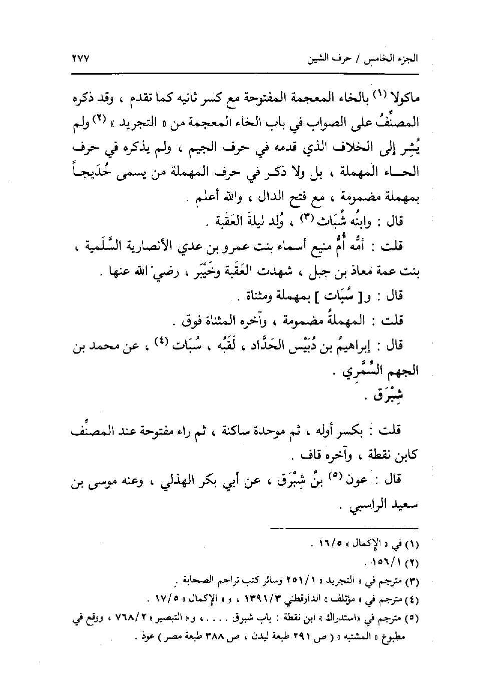 مَاكُولَا بِالْخَاءِ الْمُعْجَمَة الْمَفْتُوحَة مَعَ كسر ثَانِيَة كَمَا تقدم وَقد ذكره المُصَنّف على الصَّوَاب فِي بَاب الْخَاء الْمُعْجَمَة من التَّجْرِيد وَلم يشر إِلَى الْخلاف الَّذِي قدمه فِي حرف الْجِيم وَلم يذكرهُ فِي حرف الْحَاء الْمُهْملَة بل وَلَا ذكر فِي حرف الْمُهْملَة من يُسمى حديجا بِمُهْملَة مَضْمُومَة مَعَ فتح الدَّال وَالله اعْلَم. قَالَ: وَابْنه شباث ولد لَيْلَة الْعقبَة. قلت: أمه أم منيع أَسمَاء بنت عَمْرو بن عدي الانصارية السلمِيَّة بنت عمَّة معَاذ بن جبل شهِدت الْعقبَة وخيبر رَضِي الله عَنْهَا. قَالَ: وسبات] بِمُهْملَة ومثناة. قلت: الْمُهْملَة مَضْمُومَة وَآخره الْمُثَنَّاة فَوق. قَالَ: إِبْرَاهِيم بن دبيس الْحداد لقبه سبات عَن مُحَمَّد بن الجهم السمري. شبرق. قلت: بِكَسْر اوله ثمَّ مُوَحدَة سَاكِنة ثمَّ رَاء مَفْتُوحَة عِنْد المُصَنّف كَابْن نقطة وَآخره قَاف. قَالَ: عون بن شبرق عَن أبي بكر الْهُذلِيّ وَعنهُ مُوسَى بن سعيد الرَّاسِبِي.