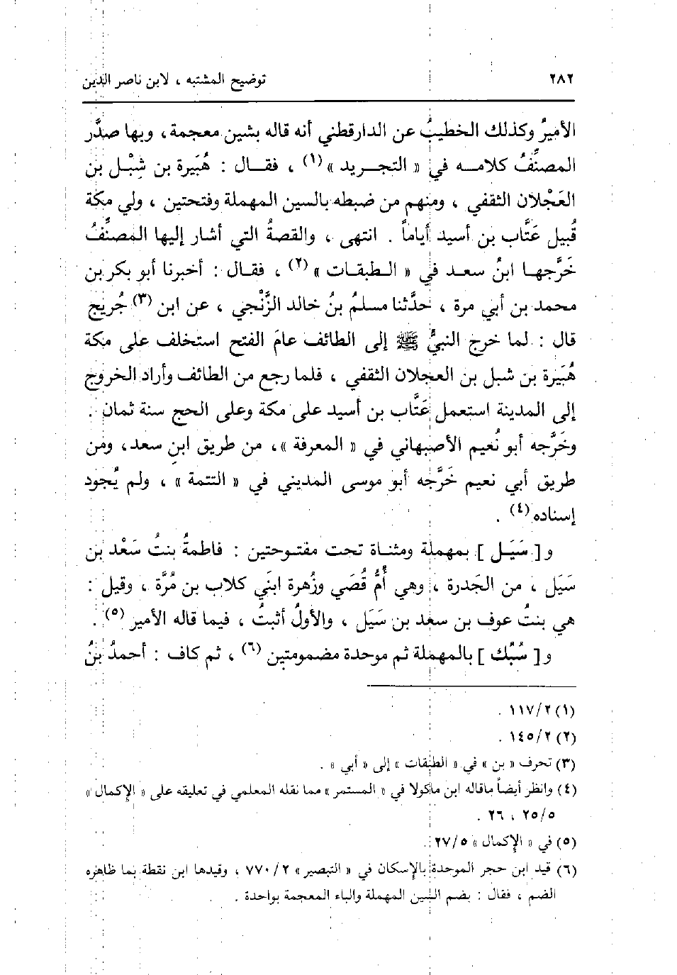 الْأَمِير وَكَذَلِكَ الْخَطِيب عَن الدَّارَقُطْنِيّ انه قَالَه بشين مُعْجمَة وَبهَا صدر المُصَنّف كَلَامه فِي التَّجْرِيد فَقَالَ: هُبَيْرَة بن شبْل بن العجلان الثَّقَفِيّ وَمِنْهُم من ضَبطه بِالسِّين الْمُهْملَة وفتحتين ولي مَكَّة قبيل عتاب بن اسيد اياما. انْتهى والقصة الَّتِي أَشَارَ إِلَيْهَا المُصَنّف خرجها ابْن سعد فِي الطَّبَقَات فَقَالَ: أخبرنَا أَبُو بكر بن مُحَمَّد بن أبي مرّة حَدثنَا مُسلم بن خَالِد الزنْجِي عَن ابْن جريج قَالَ: لما خرج النَّبِي صلى الله عَلَيْهِ وَسلم إِلَى الطَّائِف عَام الْفَتْح اسْتخْلف على مَكَّة هُبَيْرَة بن شبْل بن العجلان الثَّقَفِيّ فَلَمَّا رَجَعَ من الطَّائِف واراد الْخُرُوج إِلَى الْمَدِينَة اسْتعْمل عتاب بن اسيد على مَكَّة وعَلى الْحَج سنة ثَمَان. وخرجه أَبُو نعيم الاصبهاني فِي الْمعرفَة من طَرِيق ابْن سعد وَمن طَرِيق أبي نعيم خرجه أَبُو مُوسَى الْمَدِينِيّ فِي التَّتِمَّة وَلم يجود إِسْنَاده. و [سيل] بِمُهْملَة ومثناة تَحت مفتوحتين: فَاطِمَة بنت سعد بن سيل من الجدرة وَهِي أم قصي وزهرة ابْني كلاب بن مرّة وَقيل: هِيَ بنت عَوْف بن سعد بن سيل وَالْأول اثْبتْ فِيمَا قَالَه الْأَمِير. و [سبك] بِالْمُهْمَلَةِ ثمَّ مُوَحدَة مضمومتين ثمَّ كَاف: أَحْمد بن