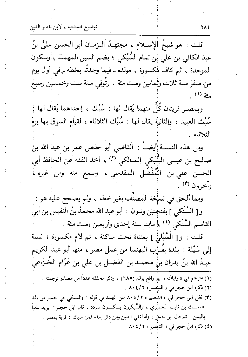 قلت: هُوَ شيخ الاسلام مُجْتَهد الزَّمَان أَبُو الْحسن عَليّ بن عبد الْكَافِي بن عَليّ بن تَمام السُّبْكِيّ بِضَم السِّين الْمُهْملَة وَسُكُون الْمُوَحدَة ثمَّ كَاف مَكْسُورَة مولده - فِيمَا وجدته بِخَطِّهِ - فِي أول يَوْم من صفر سنة ثَلَاث وَثَمَانِينَ وست مئة وَتُوفِّي سنة سِتّ وَخمسين وَسبع مئة. وبمصر قَرْيَتَانِ كل مِنْهُمَا يُقَال لَهَا: سبك إِحْدَاهمَا يُقَال لَهَا: سبك العبيد وَالثَّانيَِة يُقَال لَهَا: سبك الثُّلَاثَاء لقِيَام السُّوق بهَا يَوْم الثُّلَاثَاء. وَمن هَذِه النِّسْبَة أَيْضا: القَاضِي أَبُو حَفْص عمر بن عبد الله بن صَالح بن عِيسَى السُّبْكِيّ الْمَالِكِي اخذ الْفِقْه عَن الْحَافِظ أبي الْحسن عَليّ بن الْمفضل الْمَقْدِسِي وَسمع مِنْهُ وَمن غَيره وَآخَرُونَ. وَمِمَّا الْحق فِي نُسْخَة المُصَنّف بِغَيْر خطه وَلم يصحح عَلَيْهِ هُوَ: و [السنكي] بِفتْحَتَيْنِ وَنون: أَبُو عبد الله مُحَمَّد بن النفيس بن أبي الْقَاسِم السنكي مَاتَ سنة إِحْدَى وَأَرْبَعين وست مئة. قلت: و [السيلي] بمثناة تَحت سَاكِنة ثمَّ لَام مَكْسُورَة نِسْبَة إِلَى سيلة: بَلْدَة بِقرب البهنسا من عمل مصر مِنْهَا أَبُو عبد الْكَرِيم عبد الله بن بدران بن مُحَمَّد بن الْفضل بن عَليّ بن عرام الْخُزَاعِيّ
