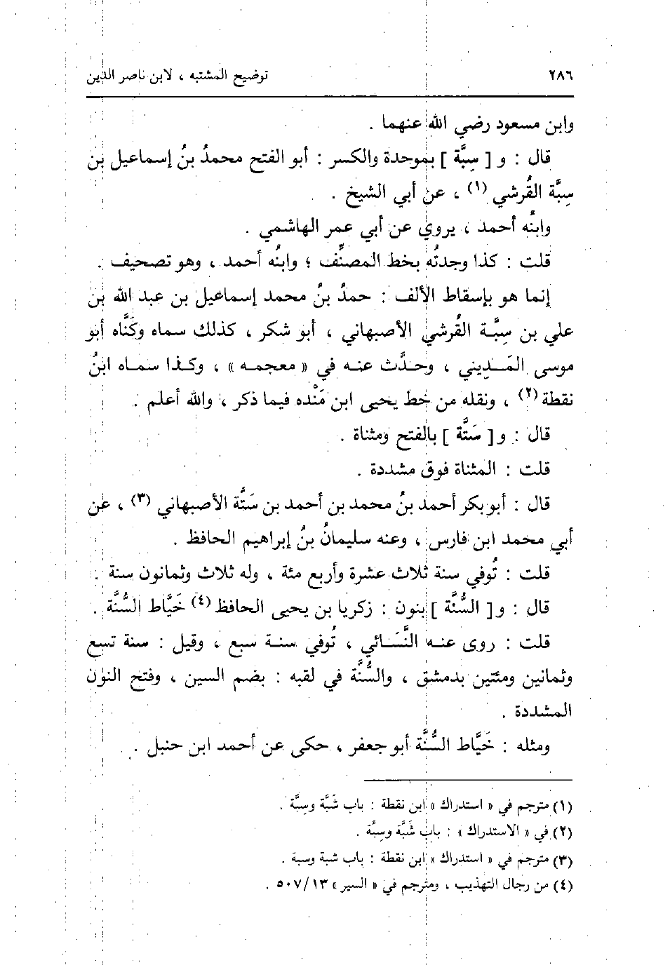 وَابْن مَسْعُود رَضِي الله عَنْهُمَا. قَالَ: و [سبة] بموحدة وَالْكَسْر: أَبُو الْفَتْح مُحَمَّد بن إِسْمَاعِيل بن سبة الْقرشِي عَن أبي الشَّيْخ. وَابْنه أَحْمد يرْوى عَن أبي عمر الْهَاشِمِي. قلت: كَذَا وجدته بِخَط المُصَنّف وَابْنه أَحْمد وَهُوَ تَصْحِيف. إِنَّمَا هُوَ باسقاط الالف: حمد بن مُحَمَّد إِسْمَاعِيل بن عبد الله بن عَليّ بن سبة الْقرشِي الاصبهاني أَبُو شكر كَذَلِك سَمَّاهُ وكناه أَبُو مُوسَى الْمَدِينِيّ وَحدث عَنهُ فِي مُعْجَمه وَكَذَا سَمَّاهُ ابْن نقطة وَنَقله من خطّ يحيى ابْن مَنْدَه فِيمَا ذكر وَالله اعْلَم. قَالَ: و [سِتَّة] بِالْفَتْح ومثناة. قلت: الْمُثَنَّاة فَوق مُشَدّدَة. قَالَ: أَبُو بكر أَحْمد بن مُحَمَّد بن أَحْمد بن سِتَّة الاصبهاني عَن أبي مُحَمَّد ابْن فَارس وَعنهُ سُلَيْمَان بن إِبْرَاهِيم الْحَافِظ. قلت: توفّي سنة ثَلَاث عشرَة وَأَرْبع مئة وَله ثَلَاث وَثَمَانُونَ سنة. قَالَ: و [السّنة] بنُون: زَكَرِيَّا بن يحيى الْحَافِظ خياط السّنة. قلت: روى عَنهُ النَّسَائِيّ توفّي سنة سبع وَقيل: سنة تسع وَثَمَانِينَ ومئتين بِدِمَشْق وَالسّنة فِي لقبه: بِضَم السِّين وَفتح النُّون الْمُشَدّدَة. وَمثله: خياط السّنة أَبُو جَعْفَر حكى عَن أَحْمد ابْن حَنْبَل.