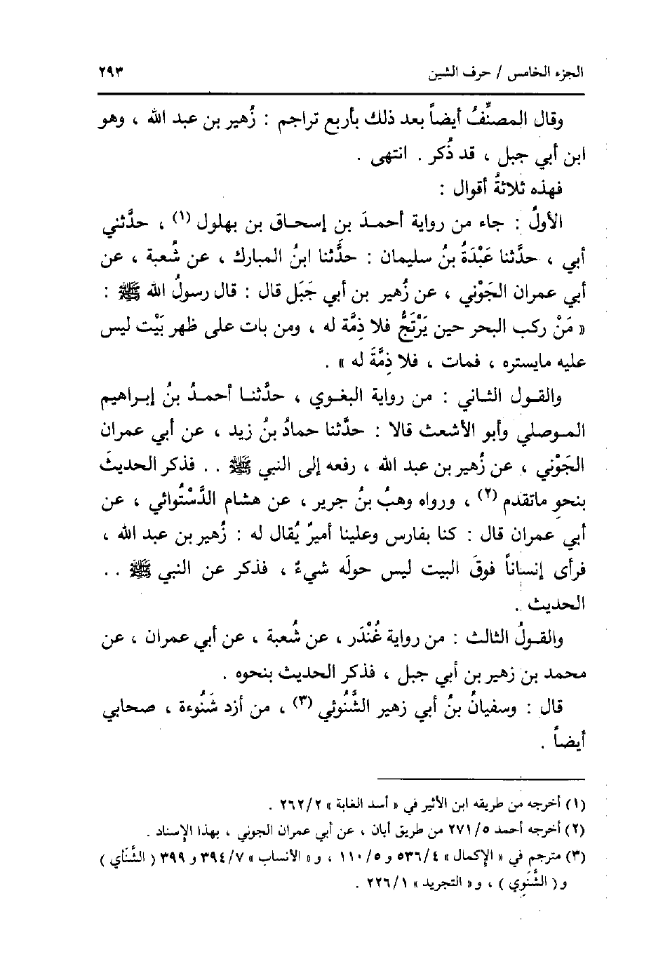 وَقَالَ المُصَنّف أَيْضا بعد ذَلِك باربع تراجم: زُهَيْر بن عبد الله وَهُوَ ابْن أبي جبل قد ذكر. انْتهى. فَهَذِهِ ثَلَاثَة أَقْوَال: الأول: جَاءَ من رِوَايَة أَحْمد بن إِسْحَاق بن بهْلُول حَدثنِي ابي حَدثنَا عَبدة بن سُلَيْمَان: حَدثنَا ابْن الْمُبَارك عَن شُعْبَة عَن أبي عمرَان الْجونِي عَن زُهَيْر بن أبي جبل قَالَ: قَالَ رَسُول الله صلى الله عَلَيْهِ وَسلم: من ركب الْبَحْر حِين يرتج فَلَا ذمَّة لَهُ وَمن بَات على ظهر بَيت لَيْسَ عَلَيْهِ مَا يستره فَمَاتَ فَلَا ذمَّة لَهُ. وَالْقَوْل الثَّانِي: من رِوَايَة الْبَغَوِيّ حَدثنَا أَحْمد بن إِبْرَاهِيم الْموصِلِي وَأَبُو الْأَشْعَث قَالَا حَدثنَا حَمَّاد بن زيد عَن أبي عمرَان الْجونِي عَن زُهَيْر بن عبد الله رَفعه إِلَى النَّبِي صلى الله عَلَيْهِ وَسلم فَذكر الحَدِيث بِنَحْوِ مَا تقدم وَرَوَاهُ وهب بن جرير عَن هِشَام الدستوَائي عَن أبي عمرَان قَالَ: كُنَّا بِفَارِس وعلينا امير يُقَال لَهُ: زُهَيْر بن عبد الله فَرَأى انسانا فَوق الْبَيْت لَيْسَ حوله شَيْء فَذكر عَن النَّبِي صلى الله عَلَيْهِ وَسلم. . الحَدِيث. وَالْقَوْل الثَّالِث: من رِوَايَة غنْدر عَن شُعْبَة عَن أبي عمرَان عَن مُحَمَّد بن زُهَيْر بن أبي جبل فَذكر الحَدِيث بِنَحْوِهِ. قَالَ: وسُفْيَان بن أبي زُهَيْر الشنوئي من أَزْد شنُوءَة صَحَابِيّ أَيْضا.