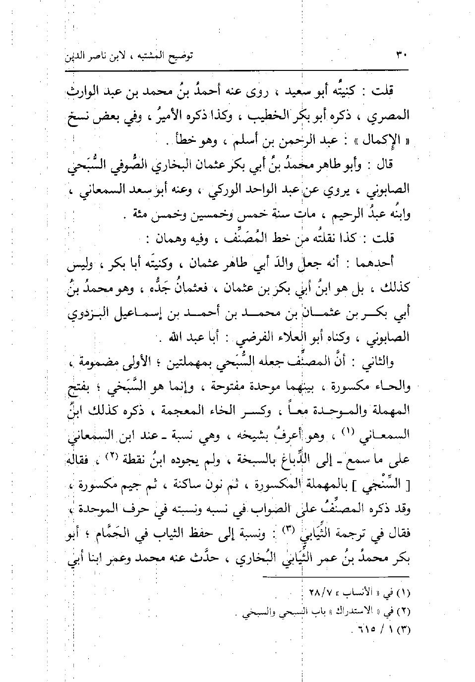 قلت: كنيته أَبُو سعيد روى عَنهُ أَحْمد بن مُحَمَّد بن عبد الْوَارِث الْمصْرِيّ ذكره أَبُو بكر الْخَطِيب وَكَذَا ذكره الْأَمِير وَفِي بعض نسخ الْإِكْمَال: عبد الرَّحْمَن بن اسْلَمْ وَهُوَ خطأ. قَالَ: وَأَبُو طَاهِر مُحَمَّد بن أبي بكر عُثْمَان البُخَارِيّ الصُّوفِي السبحي الصَّابُونِي يروي عَن عبد الْوَاحِد الوركي وَعنهُ أَبُو سعد السَّمْعَانِيّ وَابْنه عبد الرَّحِيم مَاتَ سنة خمس وَخمسين وَخمْس مئة. قلت: كَذَا نقلته من خطّ المُصَنّف وَفِيه وهمان: أَحدهمَا: انه جعل وَالِد أبي طَاهِر عُثْمَان وكنيته أَبَا بكر وَلَيْسَ كَذَلِك بل هُوَ ابْن أبي بكر بن عُثْمَان فعثمان جده وَهُوَ مُحَمَّد بن أبي بكر بن عُثْمَان بن مُحَمَّد بن أَحْمد بن إِسْمَاعِيل الْبَزْدَوِيّ الصَّابُونِي وكناه أَبُو الْعَلَاء الفرضي: أَبَا عبد الله. وَالثَّانِي: أَن المُصَنّف جعله السبحي بمهملتين الأولى مَضْمُومَة والحاء مَكْسُورَة بَينهمَا مُوَحدَة مَفْتُوحَة وَإِنَّمَا هُوَ السبخي بِفَتْح الْمُهْملَة وَالْمُوَحَّدَة مَعًا وَكسر الْخَاء الْمُعْجَمَة ذكره كَذَلِك ابْن السَّمْعَانِيّ وَهُوَ اعرف بشيخه وَهِي نِسْبَة - عِنْد ابْن السَّمْعَانِيّ على مَا سمع - إِلَى الدّباغ بالسبخة وَلم يجوده ابْن نقطة فقاله [السنجي] بِالْمُهْمَلَةِ الْمَكْسُورَة ثمَّ نون سَاكِنة ثمَّ جِيم مَكْسُورَة وَقد ذكره المُصَنّف على الصَّوَاب فِي نسبه ونسبته فِي حرف الْمُوَحدَة فَقَالَ فِي تَرْجَمَة الثيابي: وَنسبَة إِلَى حفظ الثِّيَاب فِي الْحمام أَبُو بكر مُحَمَّد بن عمر الثيابي البُخَارِيّ حدث عَنهُ مُحَمَّد وَعمر ابْنا أبي