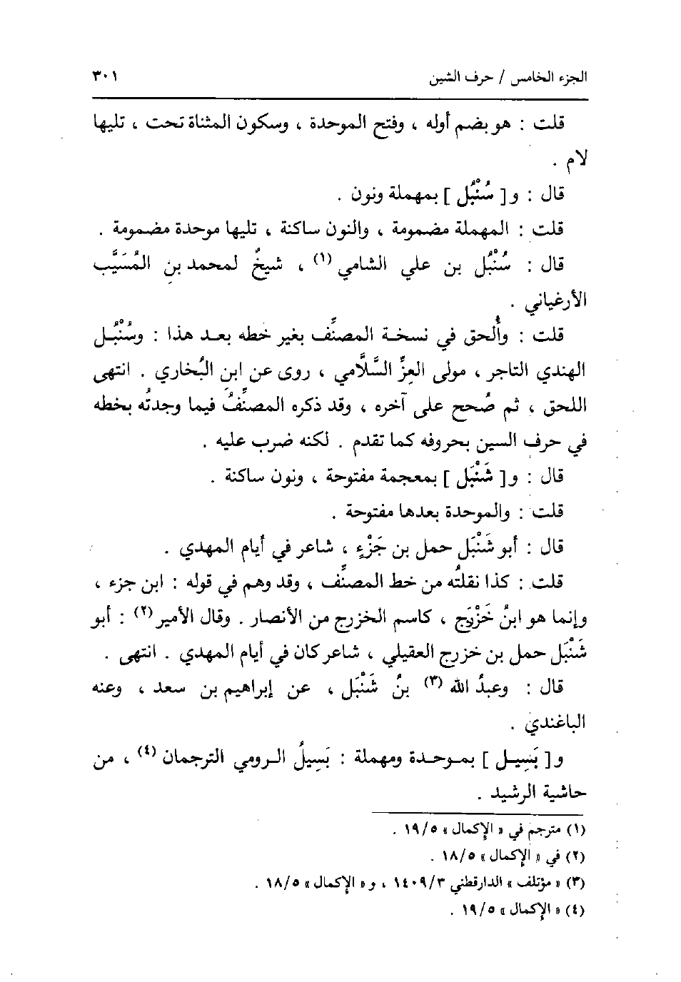 قلت: هُوَ بِضَم اوله وَفتح الْمُوَحدَة وَسُكُون الْمُثَنَّاة تَحت تَلِيهَا لَام. قَالَ: و [سنبل] بِمُهْملَة وَنون. قلت: الْمُهْملَة مَضْمُومَة وَالنُّون سَاكِنة تَلِيهَا مُوَحدَة مَضْمُومَة. قَالَ: سنبل بن عَليّ الشَّامي شيخ لمُحَمد بن الْمسيب الارغياني. قلت: وَألْحق فِي نُسْخَة المُصَنّف بِغَيْر خطه بعد هَذَا: وسنبل الْهِنْدِيّ التَّاجِر مولى الْعِزّ السلَامِي روى عَن ابْن البُخَارِيّ. انْتهى اللحق ثمَّ صحّح على آخِره وَقد ذكره المُصَنّف فِيمَا وجدته بخطة فِي حرف السِّين بِحُرُوفِهِ كَمَا تقدم. لكنه ضرب عَلَيْهِ. قَالَ: و [شنبل] بِمُعْجَمَة مَفْتُوحَة وَنون سَاكِنة. قلت: وَالْمُوَحَّدَة بعْدهَا مَفْتُوحَة. قَالَ: أَبُو شنبل حمل بن جُزْء شَاعِر فِي أَيَّام الْمهْدي. قلت: كَذَا نقلته من خطّ المُصَنّف وَقد وهم فِي قَوْله: ابْن جُزْء وَإِنَّمَا هُوَ ابْن خزرج كاسم الْخَزْرَج من الْأَنْصَار. وَقَالَ الْأَمِير: أَبُو شنبل حمل بن خزرج الْعقيلِيّ شَاعِر كَانَ فِي أَيَّام الْمهْدي. انْتهى. قَالَ: وَعبد الله بن شنبل عَن إِبْرَاهِيم بن سعد وَعنهُ الباغندي. [وبسيل] بموحدة ومهملة: بسيل الرُّومِي الترجمان من حَاشِيَة الرشيد.