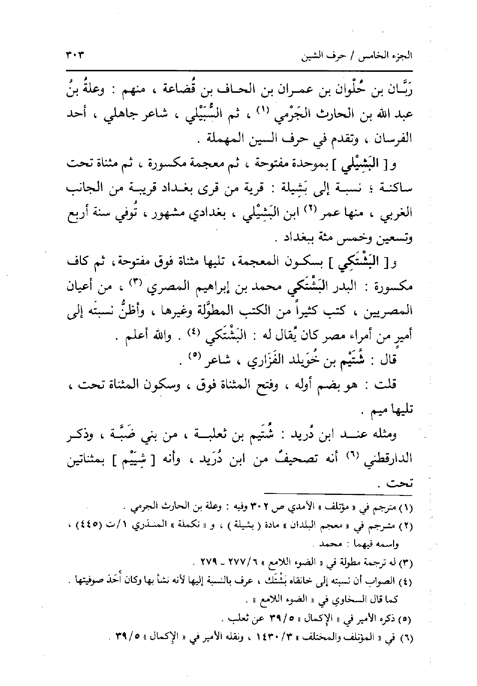 ربان بن حلوان بن عمرَان بن الحاف بن قضاعة مِنْهُم: وَعلة بن عبد الله بن الْحَارِث الْجرْمِي ثمَّ السبيلي شَاعِر جاهلي أحد الفرسان وَتقدم فِي حرف السِّين الْمُهْملَة. و [البشيلي] بموحدة مَفْتُوحَة ثمَّ مُعْجمَة مَكْسُورَة ثمَّ مثناة تَحت سَاكِنة نِسْبَة إِلَى بشيلة: قَرْيَة من قرى بَغْدَاد قريبَة من الْجَانِب الغربي مِنْهَا عمر ابْن البشيلي بغدادي مَشْهُور توفّي سنة أَربع وَتِسْعين وَخمْس مئة بِبَغْدَاد. و [البشتكي] بِسُكُون الْمُعْجَمَة تَلِيهَا مثناة فَوق مَفْتُوحَة ثمَّ كَاف مَكْسُورَة: الْبَدْر البشتكي مُحَمَّد بن إِبْرَاهِيم الْمصْرِيّ من أَعْيَان المصريين كتب كثيرا من الْكتب المطولة وَغَيرهَا واظن نسبته إِلَى أَمِير من أُمَرَاء مصر كَانَ يُقَال لَهُ: البشتكي. وَالله اعْلَم. قَالَ: شتيم بن خويلد الْفَزارِيّ شَاعِر. قلت: هُوَ بِضَم اوله وَفتح الْمُثَنَّاة فَوق وَسُكُون الْمُثَنَّاة تَحت تَلِيهَا مِيم. وَمثله عِنْد ابْن دُرَيْد: شتيم بن ثَعْلَبَة من بني ضبة وَذكر الدَّارَقُطْنِيّ انه تَصْحِيف من ابْن دُرَيْد وانه [شييم] بمثناتين تَحت.