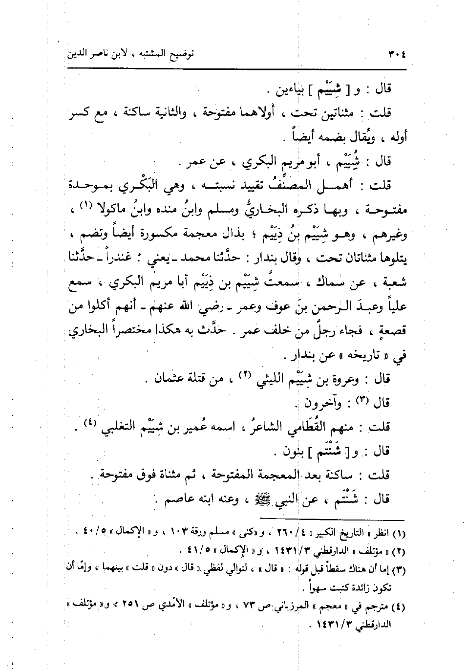 قَالَ: و [شييم] بياءين. قلت: مثناتين تَحت اولاهما مَفْتُوحَة وَالثَّانيَِة سَاكِنة مَعَ كسر اوله وَيُقَال بضمة أَيْضا. قَالَ شييم أبومريم الْبكْرِيّ عَن عمر. قلت: اهمل المُصَنّف تَقْيِيد نسبته وَهِي الْبكْرِيّ بموحدة مَفْتُوحَة وَبهَا ذكره البُخَارِيّ وَمُسلم وَابْن مَنْدَه وَابْن مَاكُولَا. وَغَيرهم وَهُوَ شييم بن ذييم بذال مُعْجمَة مَكْسُورَة أَيْضا وتضم يتلوها مثناتان تَحت وَقَالَ بنْدَار: حَدثنَا مُحَمَّد - يَعْنِي: غندرا - حَدثنَا شُعْبَة عَن سماك سَمِعت شييم بن ذييم أَبَا مَرْيَم الْبكْرِيّ سمع عليا وَعبد الرَّحْمَن بن عَوْف وَعمر - رَضِي الله عَنْهُم - انهم اكلوا من قَصْعَة فجَاء رجل من خلف عمر. حدث بِهِ هَكَذَا مُخْتَصرا البُخَارِيّ فِي تَارِيخه عَن بنْدَار. قَالَ: وَعُرْوَة بن شييم اللَّيْثِيّ من قتلة عُثْمَان. قَالَ: وَآخَرُونَ. قلت: مِنْهُم الْقطَامِي الشَّاعِر اسْمه عُمَيْر بن شييم التغلبي. قَالَ: و [شنتم] بنُون. قلت: سَاكِنة بعد الْمُعْجَمَة الْمَفْتُوحَة ثمَّ مثناة فَوق مَفْتُوحَة. قَالَ: شنتم عَن النَّبِي صلى الله عَلَيْهِ وَسلم وَعنهُ ابْنه عَاصِم.