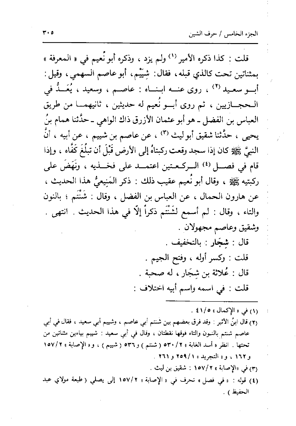 قلت: كَذَا ذكره الْأَمِير وَلم يزدْ وَذكره أَبُو نعيم فِي الْمعرفَة بمثناتين تَحت كَالَّذي قبله فَقَالَ: شييم أَبُو عَاصِم السَّهْمِي وَقيل: أَبُو سعيد روى عَنهُ ابناه: عَاصِم وَسَعِيد يعد فِي الْحِجَازِيِّينَ ثمَّ روى أَبُو نعيم لَهُ حديثين ثَانِيهمَا من طَرِيق الْعَبَّاس بن الْفضل - هُوَ أَبُو عُثْمَان الْأَزْرَق ذَاك الواهي - حَدثنَا همام بن يحيى حَدثنَا شَقِيق أَبُو لَيْث عَن عَاصِم بن شييم عَن ابيه أَن النَّبِي صلى الله عَلَيْهِ وَسلم كَانَ إِذا سجد وَقعت ركبتاه إِلَى الأَرْض قبل أَن تبلغ كَفاهُ وَإِذا قَامَ فِي فصل الرَّكْعَتَيْنِ اعْتمد على فَخذيهِ ونهض على رُكْبَتَيْهِ صلى الله عَلَيْهِ وَسلم وَقَالَ أَبُو نعيم عقيب ذَلِك: ذكر المنيعي هَذَا الحَدِيث عَن هَارُون الْحمال عَن الْعَبَّاس بن الْفضل وَقَالَ شنتم بالنُّون وَالتَّاء وَقَالَ: لم اسْمَع لشنتم ذكرا إِلَّا فِي هَذَا الحَدِيث. انْتهى. وشقيق وَعَاصِم مَجْهُولَانِ. قَالَ شجار: بِالتَّخْفِيفِ. قلت: وَكسر اوله وَفتح الْجِيم. قَالَ: علاثة بن شجار لَهُ صُحْبَة. قلت: فِي اسْمه وَاسم أَبِيه اخْتِلَاف: