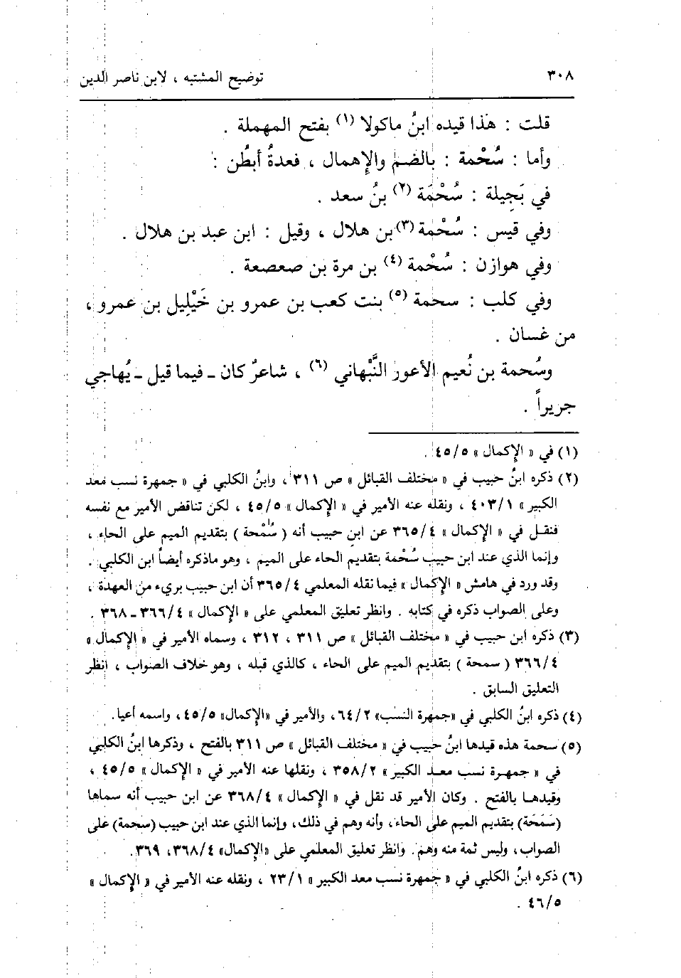 قلتك هَذَا قَيده ابْن مَاكُولَا بِفَتْح الْمُهْملَة. واما: سحمة: بِالضَّمِّ والاهمال فَعدَّة ابطن: فِي بجيلة:: سحمة بن سعد وَفِي قيس شحمة بن هِلَال وَقيل: ابْن عبد بن هِلَال. وَفِي هوَازن: سحمة بن مرّة بن صعصعة. وَفِي كلب: سحمة بنت كَعْب بن عَمْرو بن خيليل بن عَمْرو من غَسَّان. وسحمة بن نعيم الاعور النبهاني شَاعِر كَانَ - فِيمَا قيل - يهاجي جَرِيرًا.