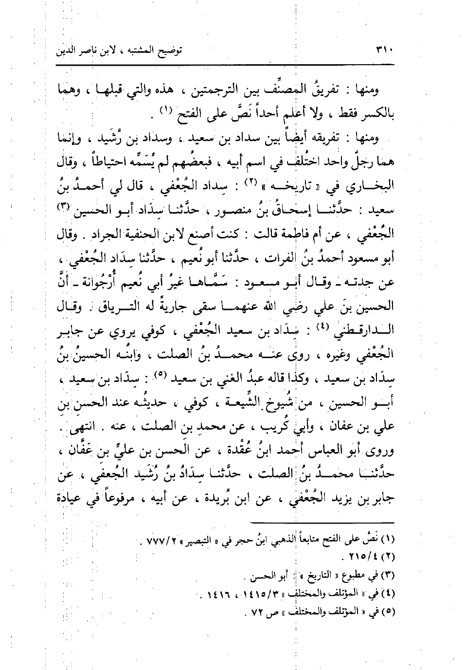 وَمِنْهَا: تَفْرِيق المُصَنّف بَين الترجمتين هَذِه وَالَّتِي قبلهَا وهما بِالْكَسْرِ فَقَط وَلَا اعْلَم احدا نَص على الْفَتْح. وَمِنْهَا: تفريقه أَيْضا بَين سداد بن سعيد وسداد بن رشيد وَإِنَّمَا هما رجل وَاحِد اخْتلف فِي اسْم ابيه فبعضهم لم يسمه احْتِيَاطًا وَقَالَ البُخَارِيّ فِي تَارِيخه: سداد الْجعْفِيّ قَالَ لي أَحْمد بن سعيد: حَدثنَا إِسْحَاق بن مَنْصُور حَدثنَا سداد أَبُو الْحُسَيْن الْجعْفِيّ عَن أم فَاطِمَة قَالَت: كنت اصْنَع لِابْنِ الْحَنَفِيَّة الْجَرَاد. وَقَالَ أَبُو مَسْعُود أَحْمد بن الْفُرَات حَدثنَا أَبُو نعيم حَدثنَا سداد الْجعْفِيّ عَن جدته - وَقَالَ أَبُو مَسْعُود: سَمَّاهَا غير أبي نعيم ارجوانة - أَن الْحُسَيْن بن عَليّ رَضِي الله عَنْهُمَا سقى جَارِيَة لَهُ الترياق. وَقَالَ الدَّارَقُطْنِيّ: سداد بن سعيد الْجعْفِيّ كُوفِي يروي عَن جَابر الْجعْفِيّ وَغَيره روى عَنهُ مُحَمَّد بن الصَّلْت وَابْنه الْحُسَيْن بن سداد بن سعيد وَكَذَا قَالَه عبد الْغَنِيّ بن سعيد: سداد بن سعيد أَبُو الْحُسَيْن من شُيُوخ الشِّيعَة كُوفِي حَدِيثه عِنْد الْحسن بن عَليّ بن عَفَّان وابي كريب عَن مُحَمَّد بن الصَّلْت عَنهُ. انْتهى. وروى أَبُو الْعَبَّاس أَحْمد ابْن عقدَة عَن الْحسن بن عَليّ بن عَفَّان حَدثنَا مُحَمَّد بن الصَّلْت حَدثنَا سداد بن رشيد الْجعْفِيّ عَن جَابر بن يزِيد الْجعْفِيّ عَن ابْن بُرَيْدَة عَن أَبِيه مَرْفُوعا فِي عِيَادَة.