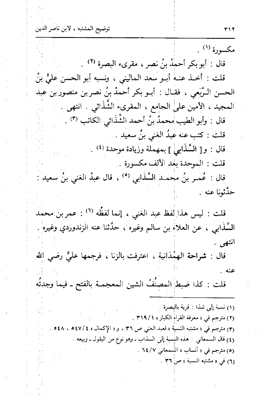 مَكْسُورَة. قَالَ: أَبُو بكر أَحْمد بن نصر مقرئ الْبَصْرَة. قلت: اخذ عَنهُ أَبُو سعد الْمَالِينِي وَنسبه أَبُو الْحسن عَليّ بن الْحسن الربعِي فَقَالَ: أَبُو بكر أَحْمد بن نصر بن مَنْصُور بن عبد الْمجِيد الامين على الْجَامِع الْمُقْرِئ الشذائي. انْتهى. قَالَ: وَأَبُو الطّيب مُحَمَّد بن أَحْمد الشذائي الْكَاتِب. قلت: كتب عَنهُ عبد الْغَنِيّ بن سعيد. قَالَ: و [السذابي] بِمُهْملَة وَزِيَادَة مُوَحدَة. قلت: الْمُوَحدَة بعد الالف مَكْسُورَة. قَالَ: عمر بن مُحَمَّد السذابي قَالَ عبد الْغَنِيّ بن سعيد: حدثونا عَنهُ. قلت: لَيْسَ هَذَا لفظ عبد الْغَنِيّ انما لَفظه: عمر بن مُحَمَّد السذابي عَن الْعَلَاء بن سَالم وَغَيره حَدثنَا عَنهُ الزندوردي وَغَيره. انْتهى. قَالَ: شراحة الهمدانية اعْترفت بِالزِّنَا فرجمها عَليّ رَضِي الله عَنهُ. قلت: كَذَا ضبط المُصَنّف الشين الْمُعْجَمَة بِالْفَتْح - فِيمَا وجدته