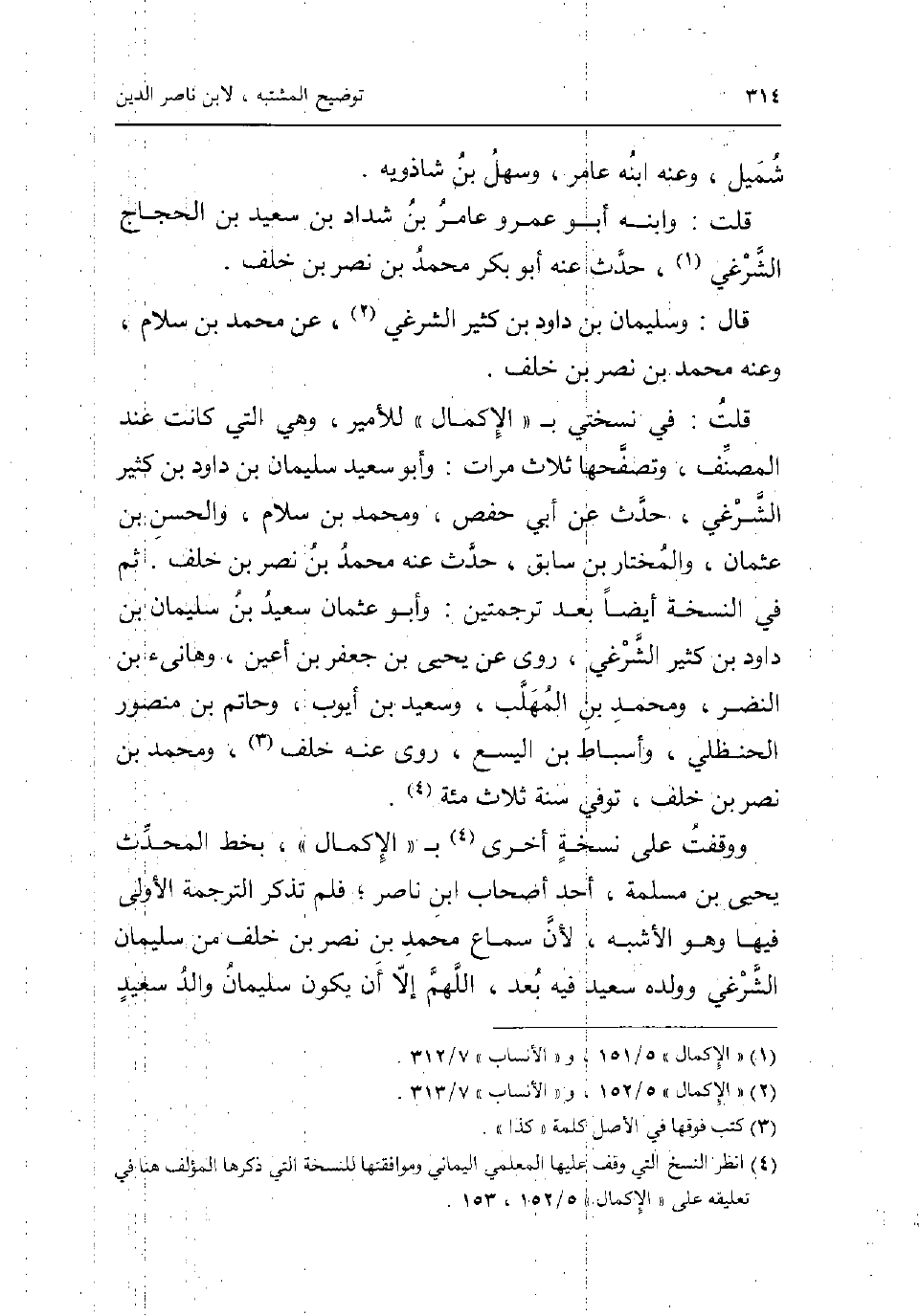 شُمَيْل وَعنهُ ابْنه عَامر وَسَهل بن شاذويه. قلت: وَابْنه أَبُو عَمْرو عَامر بن شَدَّاد بن سعيد بن الْحجَّاج الشرغي حدث عَنهُ أَبُو بكر مُحَمَّد بن نصر بن خلف. قَالَ: وَسليمَان بن دَاوُد بن كثير الشرغي عَن مُحَمَّد بن سَلام وَعنهُ مُحَمَّد بن نصر بن خلف. قلت: فِي نُسْخَتي ب الْإِكْمَال للأمير وَهِي الَّتِي كَانَت عِنْد المُصَنّف وتصفحها ثَلَاث مَرَّات: وَأَبُو سعيد سُلَيْمَان بن دَاوُد بن كثير الشرغي حدث عَن أبي حَفْص وَمُحَمّد بن سَلام وَالْحسن بن عُثْمَان وَالْمُخْتَار بن سَابق حدث عَنهُ مُحَمَّد بن نصر بن خلف. ثمَّ فِي النُّسْخَة أَيْضا بعد ترجمتين: وَأَبُو عُثْمَان سعيد بن سُلَيْمَان بن دَاوُد بن كثير الشرغي روى عَن يحيى بن جَعْفَر بن اعين وهانئ بن النَّضر وَمُحَمّد بن الْمُهلب وَسَعِيد بن ايوب وحاتم بن مَنْصُور الْحَنْظَلِي واسباط بن اليسع روى عَنهُ خلف وَمُحَمّد بن نصر بن خلف توفّي سنة ثَلَاث مئة. ووقفت على نُسْخَة أُخْرَى ب الْإِكْمَال بِخَط الْمُحدث يحيى بن مسلمة أحد أَصْحَاب ابْن نَاصِر فَلم تذكر التَّرْجَمَة الأولى فِيهَا وَهُوَ الاشبه لِأَن سَماع مُحَمَّد بن نصر بن خلف من سُلَيْمَان الشرغي وَولده سعيد فِيهِ بعد اللَّهُمَّ إِلَّا أَن يكون سُلَيْمَان وَالِد سعيد
