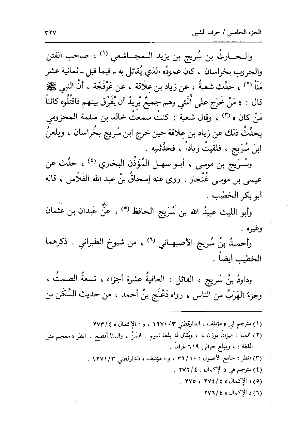 والْحَارث بن سُرَيج بن يزِيد الْمُجَاشِعِي صَاحب الْفِتَن والحروب بخراسان كَانَ عموده الَّذِي يُقَاتل بِهِ - فِيمَا قيل - ثَمَانِيَة عشر منا حدث شُعْبَة عَن زِيَاد بن علاقَة عَن عرْفجَة أَن النَّبِي صلى الله عَلَيْهِ وَسلم قَالَ: من خرج على امتي وهم جَمِيع يُرِيد أَن يفرق بَينهم فَاقْتُلُوهُ كَائِنا من كَانَ وَقَالَ شُعْبَة: كنت سَمِعت خَالِد بن سَلمَة المَخْزُومِي يحدث ذَلِك عَن زِيَاد بن علاقَة حِين خرج ابْن سُرَيج بخراسان ويلعن ابْن سُرَيج فَلَقِيت زيادا فَحَدَّثَنِيهِ. وسريج بن مُوسَى أَبُو سهل الْمُؤَذّن البُخَارِيّ حدث عَن عِيسَى بن مُوسَى غُنْجَار روى عَنهُ إِسْحَاق بن عبد الله الفلاس قَالَه أَبُو بكر الْخَطِيب. وَأَبُو اللَّيْث عبيد الله بن سُرَيج الْحَافِظ عَن عَبْدَانِ بن عُثْمَان وَغَيره. وَأحمد بن سُرَيج الاصبهاني من شُيُوخ الطَّبَرَانِيّ ذكرهمَا الْخَطِيب أَيْضا. وَدَاوُد بن سُرَيج الْقَائِل: الْعَافِيَة عشرَة أَجزَاء تِسْعَة الصمت وجزء الْهَرَب من النَّاس رَوَاهُ دعْلج بن أَحْمد من حَدِيث السكن بن