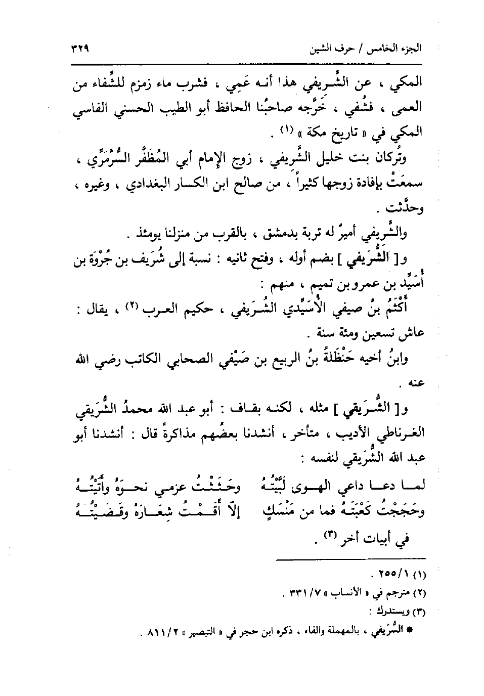الْمَكِّيّ عَن الشريفي هَذَا انه عمي فَشرب مَاء زَمْزَم للشفاء من الْعَمى فشفي خرجه صاحبنا الْحَافِظ أَبُو الطّيب الحسني الفاسي الْمَكِّيّ فِي تَارِيخ مَكَّة. وتركان بنت خَلِيل الشريفي زوج الامام أبي المظفر السرمري سَمِعت بإفادة زَوجهَا كثيرا من صَالح ابْن الكسار الْبَغْدَادِيّ وَغَيره وَحدثت. والشريفي أَمِير لَهُ تربة بِدِمَشْق بِالْقربِ من منزلنا يَوْمئِذٍ. و [الشريفي] بِضَم اوله وَفتح ثَانِيَة: نِسْبَة إِلَى شرِيف بن جروة بن اسيد بن عَمْرو بن تَمِيم مِنْهُم: اكثم بن صَيْفِي الاسيدي الشريفي حَكِيم الْعَرَب يُقَال: عَاشَ تسعين ومئة سنة. وَابْن أَخِيه حَنْظَلَة بن الرّبيع بن صَيْفِي الصَّحَابِيّ الْكَاتِب رَضِي الله عَنهُ. و [الشريقي] مثله لكنه بقاف: أَبُو عبد الله مُحَمَّد الشريقي الغرناطي الأديب مُتَأَخّر أنشدنا بَعضهم مذاكرة قَالَ: أنشدنا أَبُو عبد الله الشريقي لنَفسِهِ: