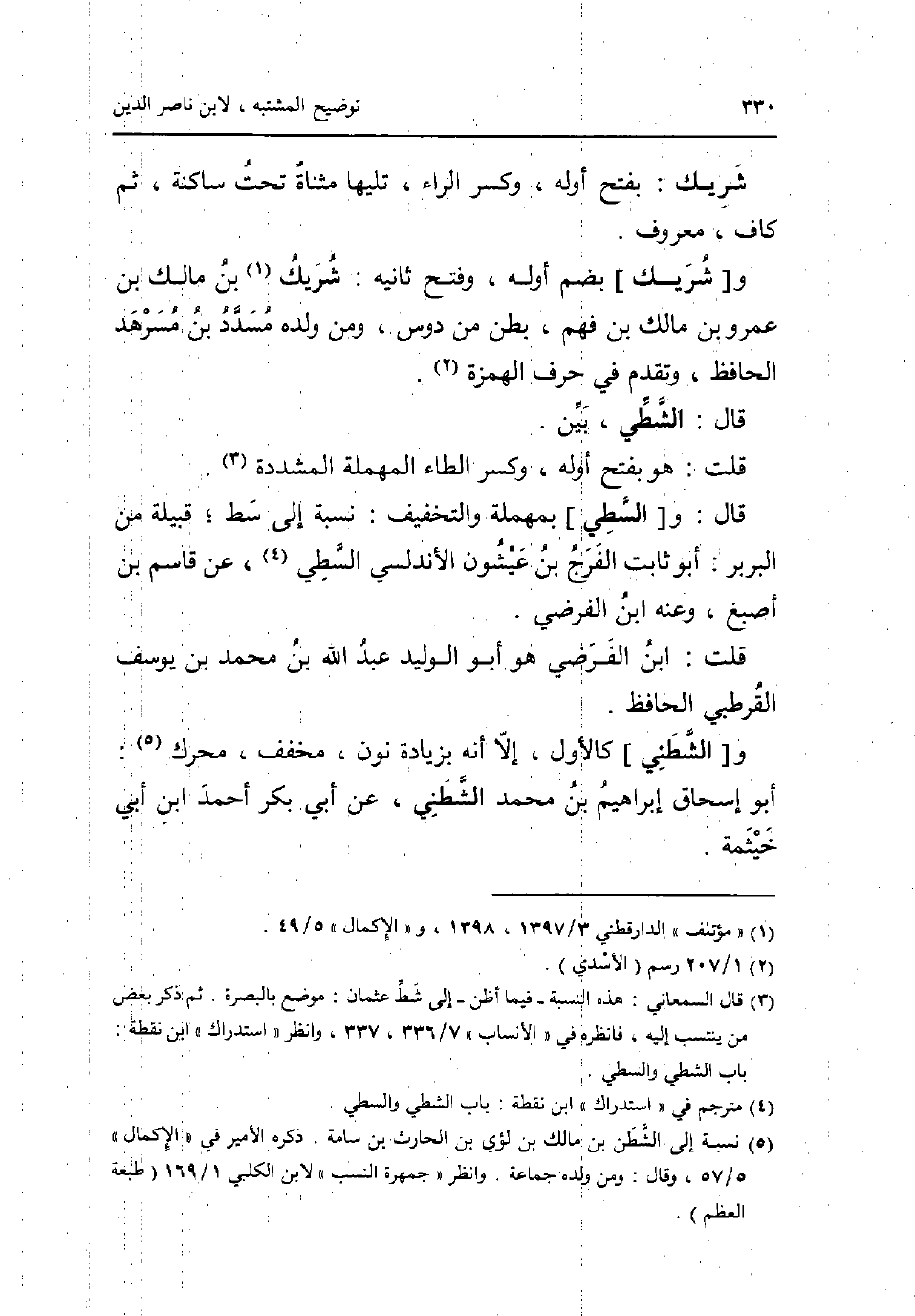 شريك: بِفَتْح اوله وَكسر الرَّاء تَلِيهَا مثناة تَحت سَاكِنة ثمَّ كَاف مَعْرُوف. و [شريك] بِضَم اوله وَفتح ثَانِيَة: شريك بن مَالك بن عَمْرو بن مَالك بن فهم بطن من دوس وَمن وَلَده مُسَدّد بن مسرهد الْحَافِظ وَتقدم فِي حرف الْهمزَة. قَالَ: الشطي بَين. قلت: هُوَ بِفَتْح اوله وَكسر الطَّاء الْمُهْملَة الْمُشَدّدَة. قَالَ: و [السطي] بِمُهْملَة وَالتَّخْفِيف: نِسْبَة إِلَى سط قَبيلَة من البربر: أَبُو ثَابت الْفرج بن عيشون الأندلسي السطي عَن قَاسم بن اصبغ وَعنهُ ابْن الفرضي. قلت: ابْن الفرضي هُوَ أَبُو الْوَلِيد عبد الله بن مُحَمَّد بن يُوسُف الْقُرْطُبِيّ الْحَافِظ. و [الشطني] كَالْأولِ إِلَّا انه بِزِيَادَة نون مخفف محرك: أَبُو إِسْحَاق إِبْرَاهِيم بن مُحَمَّد الشطني عَن أبي بكر أَحْمد بن أبي خَيْثَمَة.