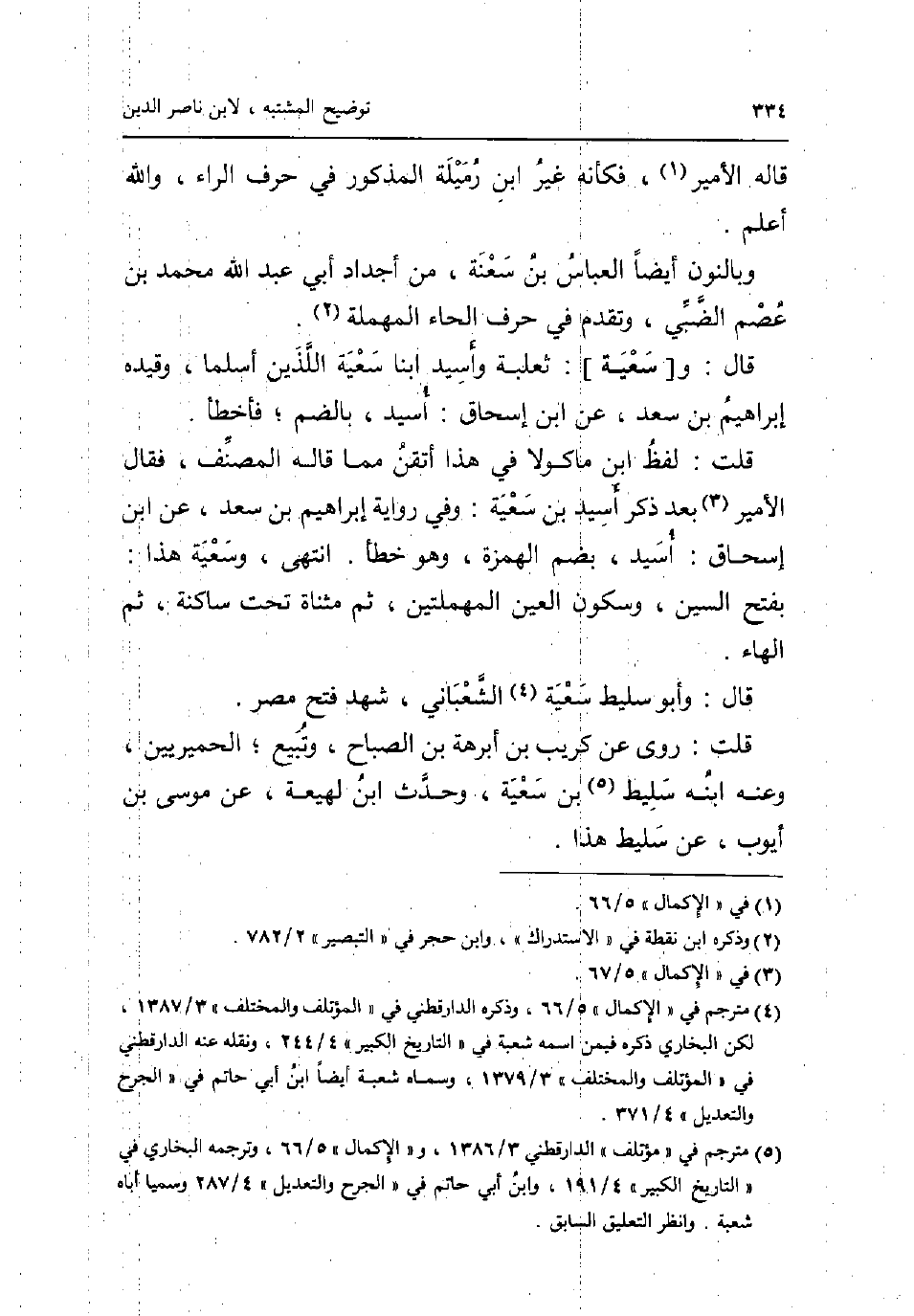 قَالَه الْأَمِير فَكَأَنَّهُ غير ابْن رميلة الْمَذْكُور فِي حرف الرَّاء وَالله اعْلَم. وبالنون أَيْضا الْعَبَّاس بن سعنة من اجداد أبي عبد الله مُحَمَّد بن عصم الضَّبِّيّ وَتقدم فِي حرف الْحَاء الْمُهْملَة. قَالَ: و [سعية] : ثَعْلَبَة واسيد ابْنا سعية اللَّذين اسلما وَقَيده إِبْرَاهِيم بن سعد عَن ابْن إِسْحَاق: أسيد بِالضَّمِّ فَأَخْطَأَ. قلت: لفظ ابْن مَاكُولَا فِي هَذَا اتقن مِمَّا قَالَه المُصَنّف فَقَالَ الْأَمِير بعد ذكر اسيد بن سعية: وَفِي رِوَايَة إِبْرَاهِيم بن سعد عَن ابْن إِسْحَاق: اسيد بِضَم الْهمزَة وَهُوَ خطأ. انْتهى وسعية هَذَا: بِفَتْح السِّين وَسُكُون الْعين الْمُهْمَلَتَيْنِ ثمَّ مثناة تَحت سَاكِنة ثمَّ الْهَاء. قَالَ: وَأَبُو سليط سعية الشَّعْبَانِي شهد فتح مصر. قلت: روى عَن كريب بن ابرهة بن الصَّباح وتبيع الحميريين وَعنهُ ابْنه سليط بن سعية وَحدث ابْن لَهِيعَة عَن مُوسَى بن ايوب عَن سليط هَذَا.