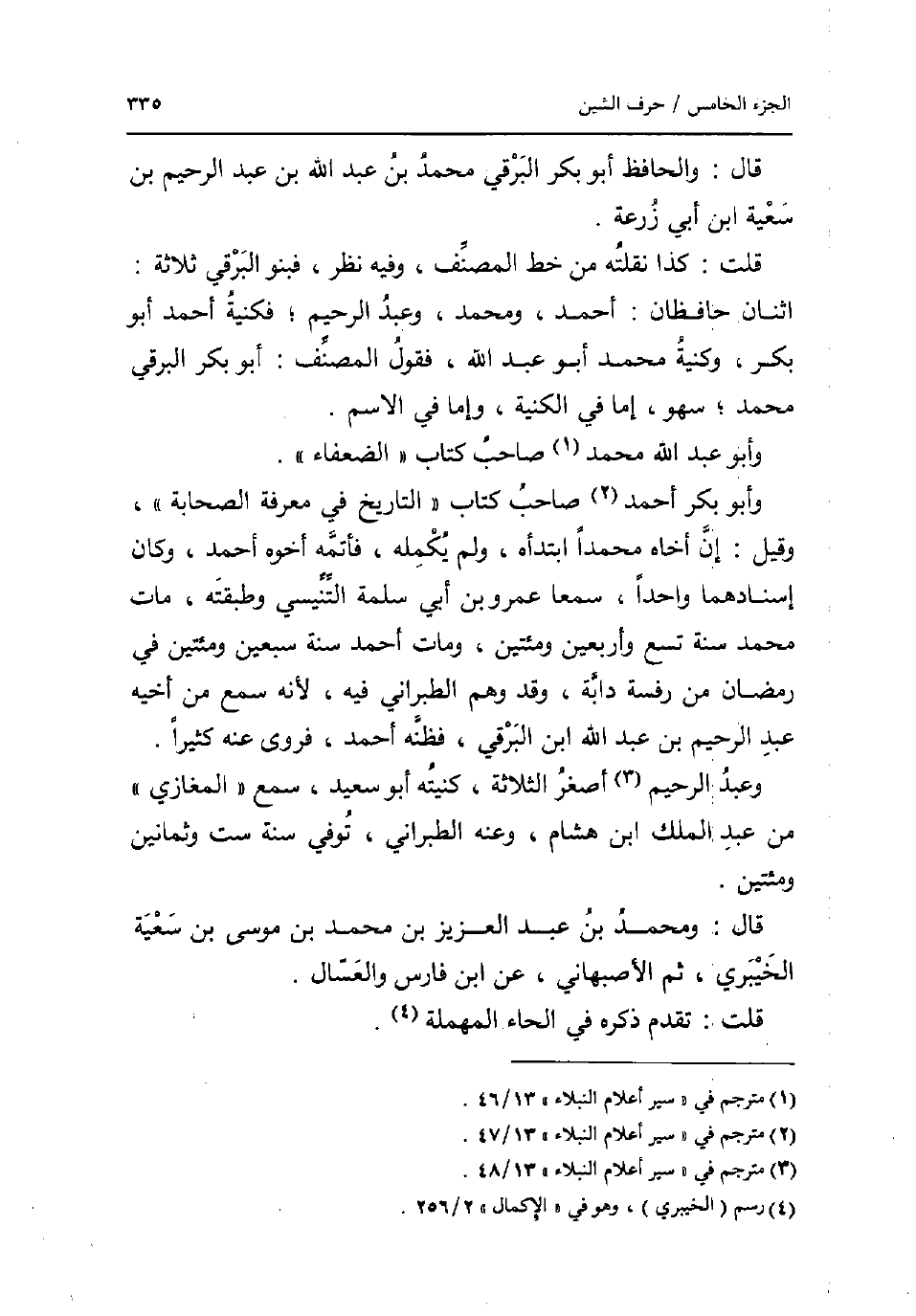 قَالَ: والحافظ أَبُو بكر البرقي مُحَمَّد بن عبد الله بن عبد الرَّحِيم بن سعية ابْن أبي زرْعَة. قلت: كَذَا نقلته من خطّ المُصَنّف وَفِيه نظر فبنو البرقي ثَلَاثَة: اثْنَان حَافِظَانِ: أَحْمد وَمُحَمّد وَعبد الرَّحِيم فكنية أَحْمد أَبُو بكر وكنية مُحَمَّد أَبُو عبد الله فَقَوْل المُصَنّف: أَبُو بكر البرقي مُحَمَّد سَهْو إِمَّا فِي الكنية وَإِمَّا فِي الِاسْم. وَأَبُو عبد الله مُحَمَّد صَاحب كتاب الضُّعَفَاء. وَأَبُو بكر أَحْمد صَاحب كتاب التَّارِيخ فِي معرفَة الصَّحَابَة وَقيل: إِن أَخَاهُ مُحَمَّدًا ابتدأه وَلم يكمله فأتمه اخوه احْمَد وَكَانَ إسنادهما وَاحِدًا سمعا عَمْرو بن أبي سَلمَة التنيسِي وطبقته مَاتَ مُحَمَّد سنة تسع واربعين ومئتين وَمَات أَحْمد سنة سبعين ومئتين فِي رَمَضَان من رفسة دَابَّة وَقد وهم الطَّبَرَانِيّ فِيهِ لِأَنَّهُ سمع من أَخِيه عبد الرَّحِيم بن عبد الله ابْن البرقي فَظَنهُ احْمَد فروى عَنهُ كثيرا. وَعبد الرَّحِيم اصغر الثَّلَاثَة كنيته أَبُو سعيد سمع الْمَغَازِي من عبد الْملك ابْن هِشَام وَعنهُ الطَّبَرَانِيّ توفّي سنة سِتّ وَثَمَانِينَ ومئتين. قَالَ: وَمُحَمّد بن عبد الْعَزِيز بن مُحَمَّد بن مُوسَى بن سعية الْخَيْبَرِيّ ثمَّ الاصبهاني عَن ابْن فَارس والعسال. قلت: تقدم ذكره فِي الْحَاء الْمُهْملَة.