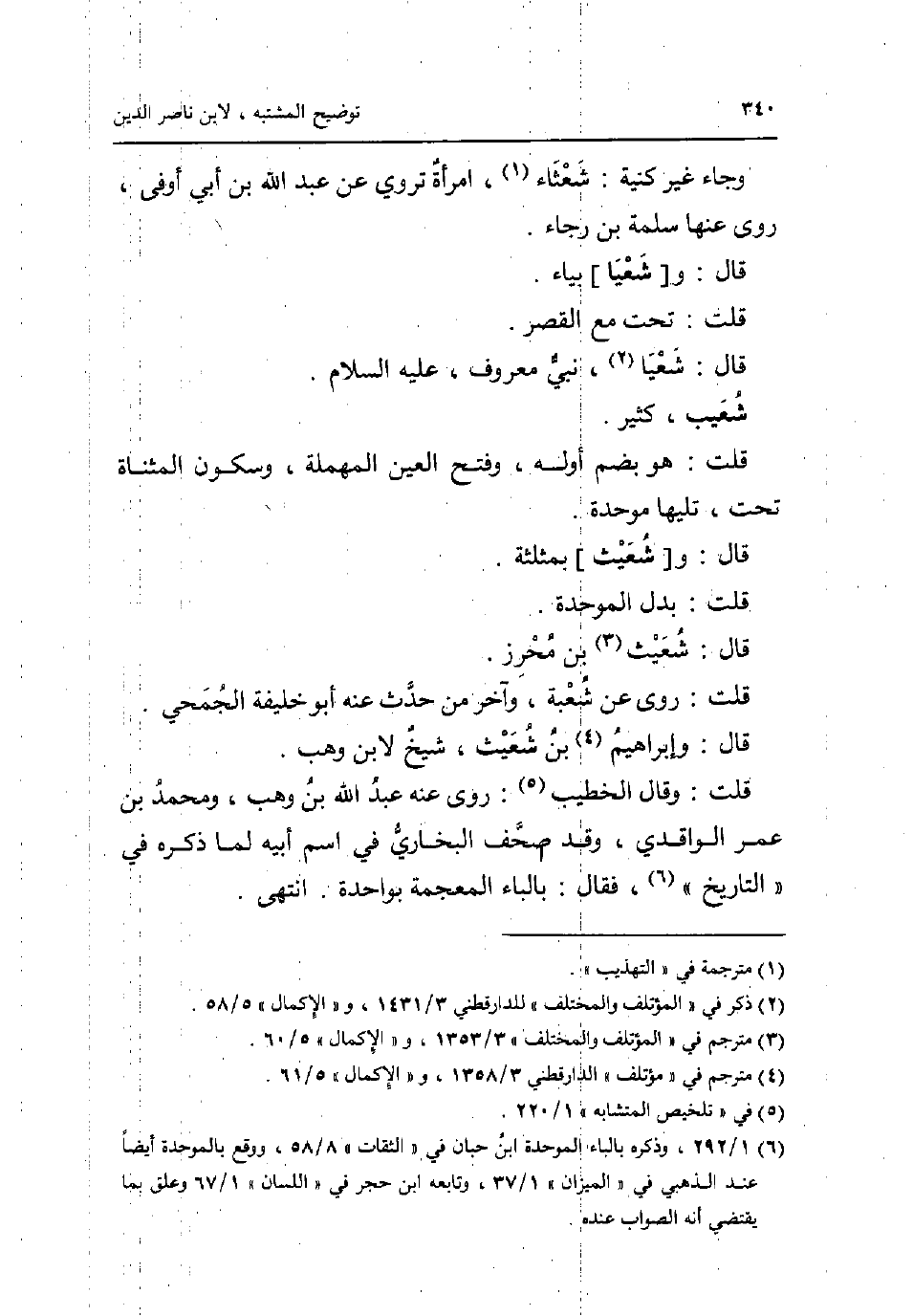 وَجَاء غير كنية: شعثاء امْرَأَة تروي عَن عبد الله بن أبي اوفى روى عَنْهَا سَلمَة بن رَجَاء. قَالَ: و [شعيا] بياء. قلت: تَحت مَعَ الْقصر. قَالَ: شعيا نَبِي مَعْرُوف عَلَيْهِ السَّلَام. شُعَيْب كثير قلت: هُوَ بِضَم أَوله وَفتح الْعين الْمُهْملَة وَسُكُون الْمُثَنَّاة تَحت تَلِيهَا مُوَحدَة. قَالَ: و [شعيث] بمثلثة. قلت: بدل الْمُوَحدَة. قَالَ: شعيث بن مُحرز. قلت: روى عَن شُعْبَة وَآخر من حدث عَنهُ أَبُو خَليفَة الجُمَحِي. قَالَ: وَإِبْرَاهِيم بن شعيث شيخ لِابْنِ وهب. قلت: وَقَالَ الْخَطِيب: روى عَنهُ عبد الله بن وهب وَمُحَمّد بن عمر الْوَاقِدِيّ وَقد صحف البُخَارِيّ فِي اسْم أَبِيه لما ذكره فِي التَّارِيخ فَقَالَ: بِالْبَاء الْمُعْجَمَة بِوَاحِدَة. انْتهى.