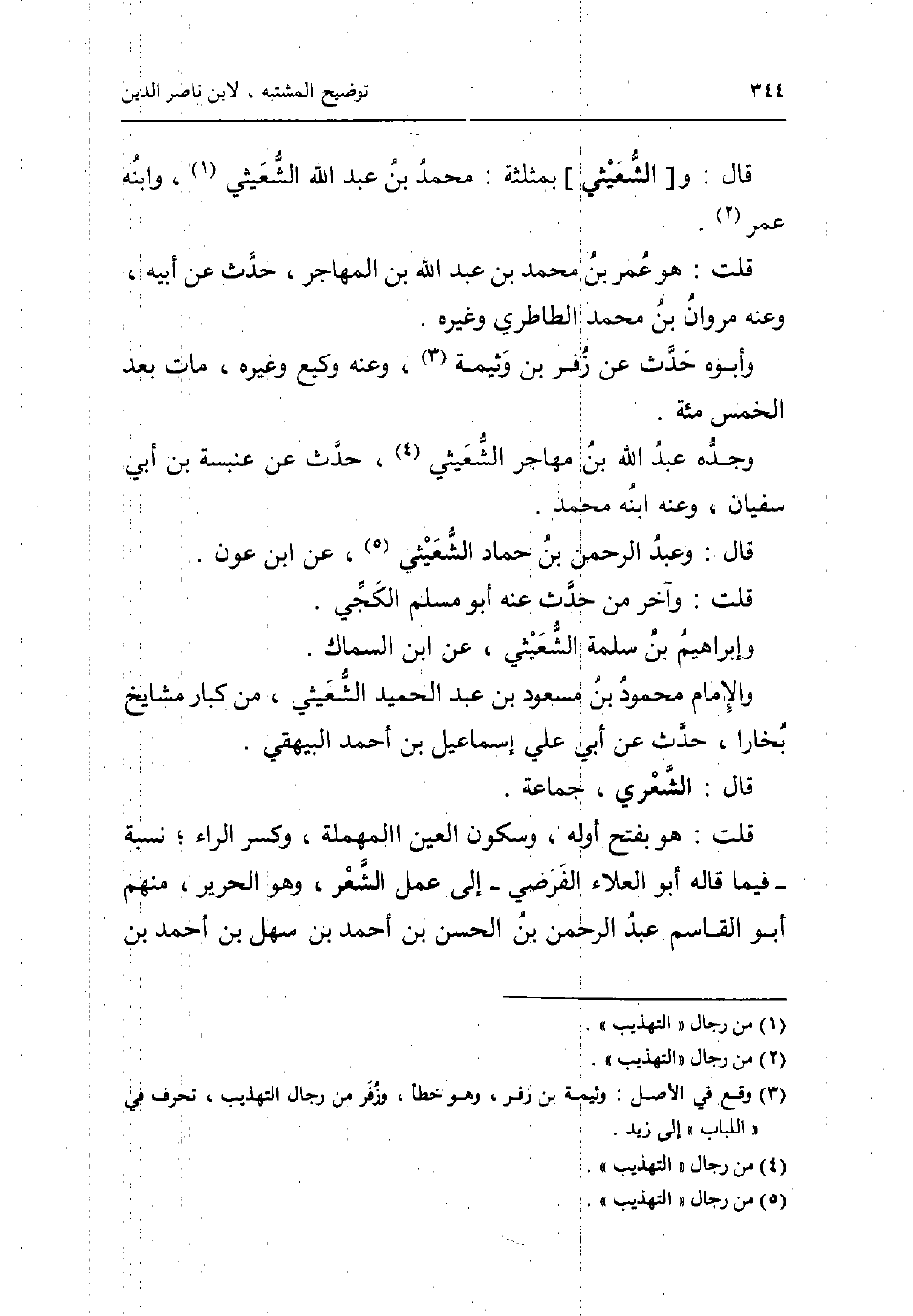 قَالَ: و [الشعيثي] بمثلثة: مُحَمَّد بن عبد الله الشعيثي وَابْنه عمر. قلت: هُوَ عمر بن مُحَمَّد بن عبد الله بن المُهَاجر حدث عَن ابيه وَعنهُ مَرْوَان بن مُحَمَّد الطاطري وَغَيره. وَأَبُو حدث عَن زفر بن وثيمة وَعنهُ وَكِيع وَغَيره مَاتَ بعد الْخمس مئة. وجده عبد الله بن مهَاجر الشعيثي حدث عَن عَنْبَسَة بن أبي سُفْيَان وَعنهُ ابْنه مُحَمَّد. قَالَ: وَعبد الرَّحْمَن بن حَمَّاد الشعيثي عَن ابْن عون. قلت: وَآخر من حدث عَنهُ أَبُو مُسلم الْكَجِّي. وَإِبْرَاهِيم بن سَلمَة الشعيثي عَن ابْن السماك. وَالْإِمَام مَحْمُود بن مَسْعُود بن عبد الحميد الشعيثي من كبار مَشَايِخ بخارا حدث عَن أبي عَليّ إِسْمَاعِيل بن أَحْمد الْبَيْهَقِيّ. قَالَ: الشعري جمَاعَة. قلت: هُوَ بِفَتْح اوله وَسُكُون الْعين الْمُهْملَة وَكسر الرَّاء نِسْبَة - فِيمَا قَالَه أَبُو الْعَلَاء الفرضي - إِلَى عمل الشّعْر وَهُوَ الْحَرِير مِنْهُم أَبُو الْقَاسِم عبد الرَّحْمَن بن الْحسن بن أَحْمد بن سهل بن أَحْمد بن