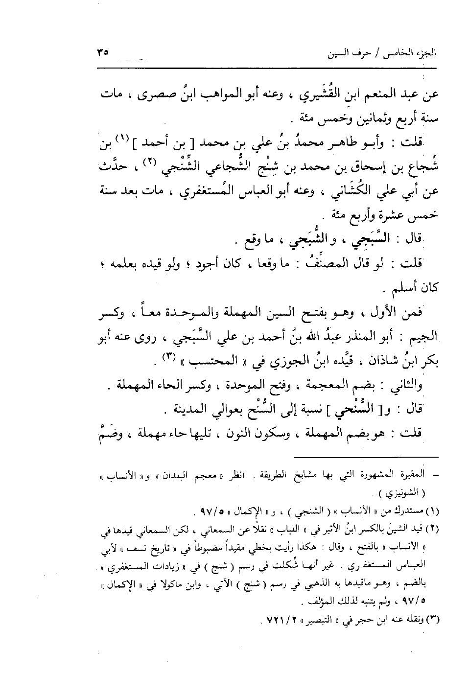 عَن عبد الْمُنعم ابْن الْقشيرِي وَعنهُ أَبُو الْمَوَاهِب ابْن صصري مَاتَ سنة أَربع وَثَمَانِينَ وَخمْس مئة. قلت: وَأَبُو طَاهِر مُحَمَّد بن عَليّ بن مُحَمَّد [بن أَحْمد] بن شُجَاع بن إِسْحَاق بن مُحَمَّد بن شنج الشجاعي الشنجي حدث عَن أبي عَليّ الكشاني وَعنهُ أَبُو الْعَبَّاس المستغفري مَاتَ بعد سنة خمس عشرَة واربع مئة. قَالَ: السبجي والشبحي مَا وَقع. قلت: لَو قَالَ المُصَنّف: مَا وَقعا كَانَ اجود وَلَو قَيده بِعِلْمِهِ كَانَ اسْلَمْ. فَمن الأول وَهُوَ بِفَتْح السِّين الْمُهْملَة وَالْمُوَحَّدَة مَعًا وَكسر الْجِيم: أَبُو الْمُنْذر عبد الله بن أَحْمد بن عَليّ السبجي روى عَنهُ أَبُو بكر ابْن شَاذان قَيده ابْن الْجَوْزِيّ فِي الْمُحْتَسب. وَالثَّانِي: بِضَم الْمُعْجَمَة وَفتح الْمُوَحدَة وَكسر الْحَاء الْمُهْملَة. قَالَ: و [السنحي] نِسْبَة إِلَى السنح بعوالي الْمَدِينَة. قلت: هُوَ بِضَم الْمُهْملَة وَسُكُون النُّون تَلِيهَا حاء مُهْملَة وَضم 26