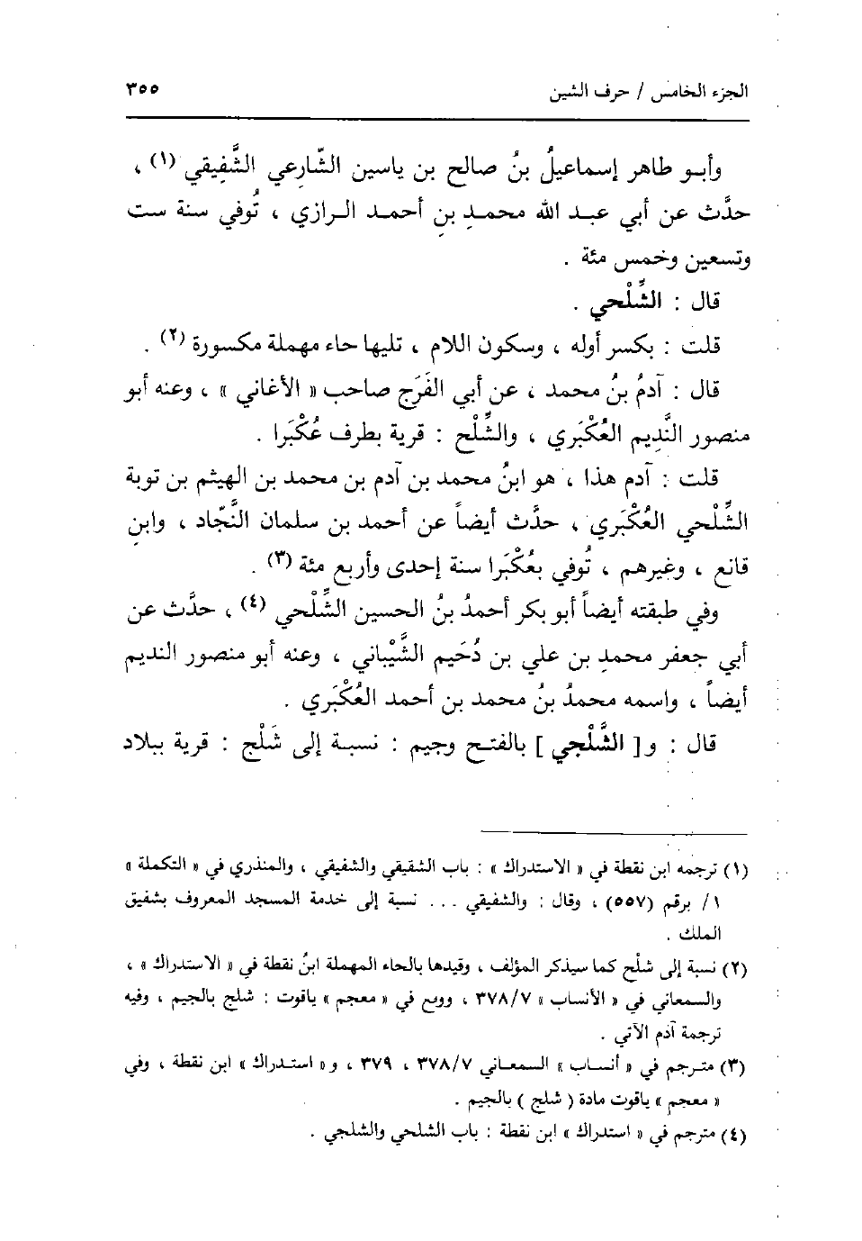 وَأَبُو طَاهِر إِسْمَاعِيل بن صَالح بن ياسين الشارعي الشفيقي حدث عَن أبي عبد الله مُحَمَّد بن أَحْمد الرَّازِيّ توفّي سنة سِتّ وَتِسْعين وَخمْس مئة. قَالَ: الشلحي. قلت: بِكَسْر اوله وَسُكُون اللَّام تَلِيهَا حاء مُهْملَة مَكْسُورَة قَالَ: آدم بن مُحَمَّد بن عَن أبي الْفرج صَاحب الاغاني وَعنهُ أَبُو مَنْصُور النديم العكبري والشلح: قَرْيَة بِطرف عكبرا قلت: آدم هَذَا هُوَ ابْن مُحَمَّد بن آدم بن مُحَمَّد بن الْهَيْثَم بن توية الشلحي العكبري حدث أَيْضا عَن أَحْمد بن سلمَان النجاد وَابْن قَانِع وَغَيرهم توفّي بعكبرا سنة إِحْدَى وَأَرْبع مئة وَفِي طبقته أَيْضا أَبُو بكر أَحْمد بن الْحُسَيْن الشلحي حدث عَن أبي جَعْفَر مُحَمَّد بن عَليّ بن دُحَيْم الشَّيْبَانِيّ وَعنهُ أَبُو مَنْصُور النديم ايضا واسْمه مُحَمَّد بن مُحَمَّد بن أَحْمد العكبري قَالَ: و [الشلجي] بِالْفَتْح وجيم: نِسْبَة إِلَى شلج: قَرْيَة بِبِلَاد