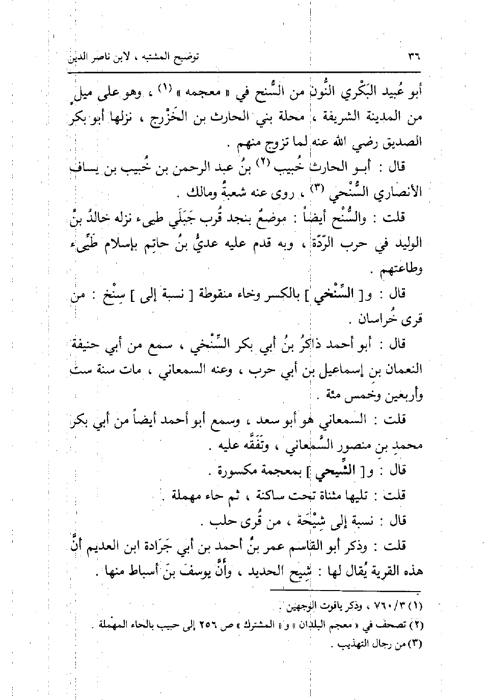 أَبُو عبيد الْبكْرِيّ النُّون من السنح فِي مُعْجَمه وَهُوَ على ميل من الْمَدِينَة الشَّرِيفَة محلّة بني الْحَارِث بن الْخَزْرَج نزلها أَبُو بكر الصّديق رَضِي الله عَنهُ لما تزوج مِنْهُم. قَالَ: أَبُو الْحَارِث خبيب بن عبد الرَّحْمَن بن خبيب بن يسَاف الْأنْصَارِيّ السنحي روى عَنهُ شُعْبَة وَمَالك. قلت: والسنح أَيْضا: مَوضِع بِنَجْد قرب جبلي طَيء نزله خَالِد بن الْوَلِيد فِي حَرْب الرِّدَّة وَبِه قدم عَلَيْهِ عدي بن حَاتِم بِإِسْلَام طَيء وطاعتهم. قَالَ: و [السنخي] بِالْكَسْرِ وخاء منقوطة [نِسْبَة إِلَى] سنخ: من قرى خُرَاسَان. قَالَ: أَبُو أَحْمد ذَاكر بن أبي بكر السنخي سمع من أبي حنيفَة النُّعْمَان بن إِسْمَاعِيل بن أبي حَرْب وَعنهُ السَّمْعَانِيّ مَاتَ سنة سِتّ وَأَرْبَعين وَخمْس مئة. قلت: السَّمْعَانِيّ هُوَ أَبُو سعد وَسمع أَبُو أَحْمد أَيْضا من أبي بكر مُحَمَّد بن مَنْصُور السَّمْعَانِيّ وتفقه عَلَيْهِ. قَالَ: و [الشيحي] بِمُعْجَمَة مَكْسُورَة. قلت: تَلِيهَا مثناة تَحت سَاكِنة ثمَّ حاء مُهْملَة. قَالَ: نِسْبَة إِلَى شيحة من قرى حلب. قلت: وَذكر أَبُو الْقَاسِم عمر بن أَحْمد بن أبي جَرَادَة ابْن العديم أَن هَذِه الْقرْيَة يُقَال لَهَا: شيح الْحَدِيد وَأَن يُوسُف بن اسباط مِنْهَا.