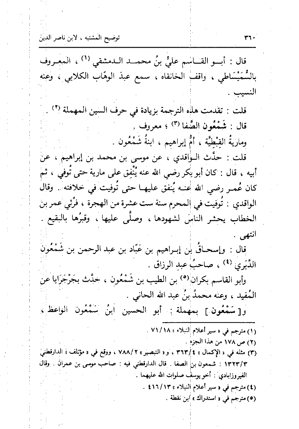 قَالَ: أَبُو الْقَاسِم عَليّ بن مُحَمَّد الدِّمَشْقِي الْمَعْرُوف بالسميساطي وَاقِف الخانقاه سمع عبد الْوَهَّاب الْكلابِي وَعنهُ النسيب قلت: تقدّمت هَذِه التَّرْجَمَة بِزِيَادَة فِي حرف السِّين الْمُهْملَة قَالَ: شَمْعُون الصَّفَا مَعْرُوف ومارية الْقبْطِيَّة أم إِبْرَاهِيم ابْنة شَمْعُون قلت: حدث الْوَاقِدِيّ عَن مُوسَى بن مُحَمَّد بن ابراهيم عَن ابيه قَالَ: كَانَ أَبُو بكر رَضِي الله عَنهُ ينْفق على مَارِيَة حَتَّى توفّي ثمَّ كَانَ عمر رَضِي الله عَنهُ ينْفق عَلَيْهَا حَتَّى توفيت فِي خِلَافَته وَقَالَ الْوَاقِدِيّ: توفيت فِي الْمحرم سنة سِتّ عشرَة من الْهِجْرَة فَرُئِيَ عمر بن الْخطاب يحْشر النَّاس لشهودها وَصلى عَلَيْهَا وقبرها بِالبَقِيعِ انْتهى قَالَ: واسحاق بن إِبْرَاهِيم بن عباد بن عبد الرَّحْمَن بن شَمْعُون الدبرِي صَاحب عبد الرَّزَّاق وَأَبُو الْقَاسِم بكران بن الطّيب بن شَمْعُون حدث بجرجرايا عَن الْمُفِيد وَعنهُ مُحَمَّد بن عبد الحاني و [سمعون] بِمُهْملَة: أَبُو الْحُسَيْن ابْن سمعون الْوَاعِظ