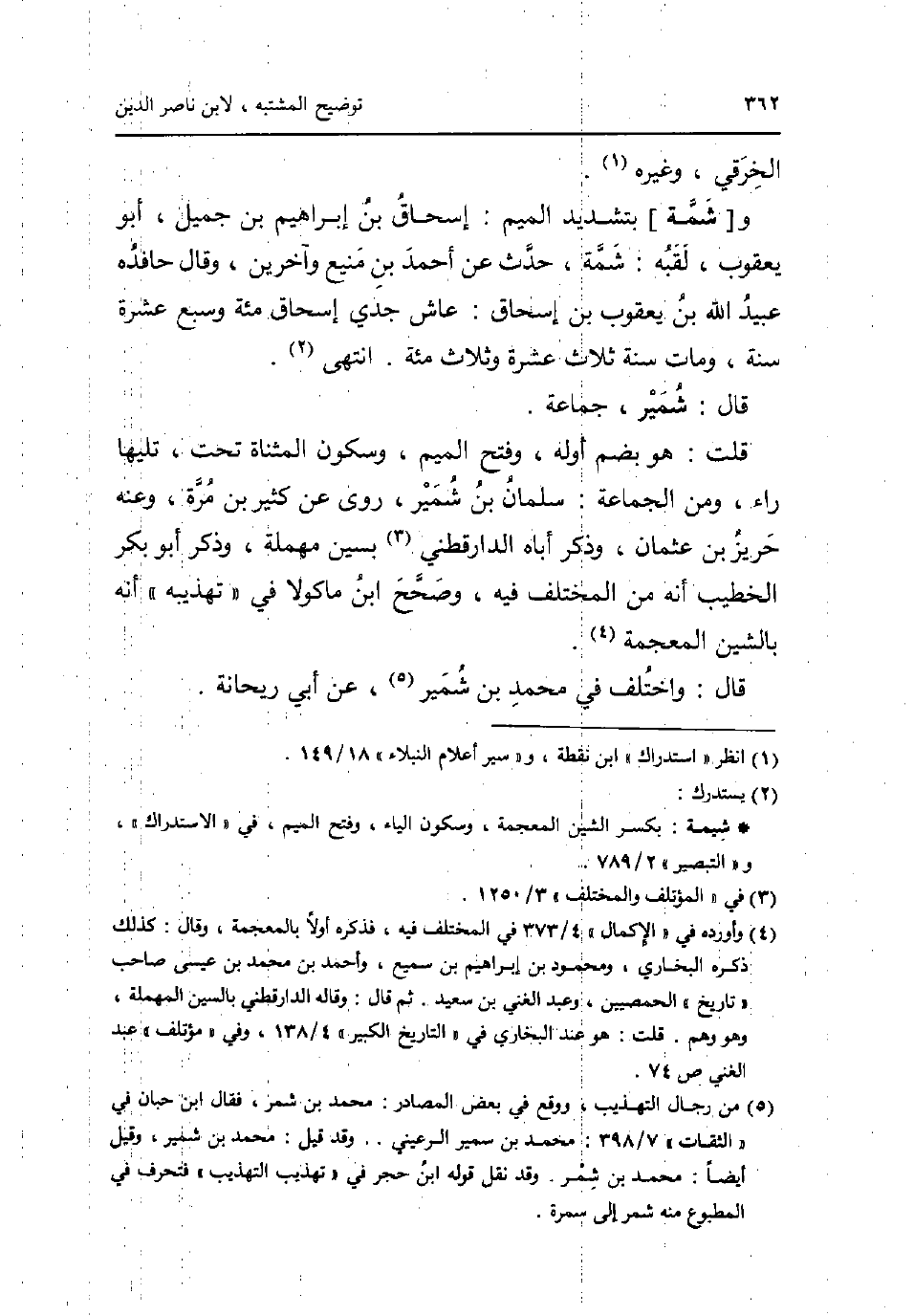 الْخرقِيّ وَغَيره و [شمة] بتَشْديد الْمِيم: إِسْحَاق بن إِبْرَاهِيم بن جميل أَبُو يَعْقُوب لقبه: شمة حدث عَن أَحْمد بن منيع وَآخَرين وَقَالَ حافده عبيد الله بن يَعْقُوب بن إِسْحَاق: عَاشَ جدي إِسْحَاق مئة وَسبع عشرَة سنة ن وَمَات سنة عشرَة وَثَلَاث مئة انْتهى قَالَ: شمير جمَاعَة قلت: هُوَ بِضَم اوله وَفتح الْمِيم وَسُكُون الْمُثَنَّاة تَحت تَلِيهَا رَاء وَمن الْجَمَاعَة: سلمَان بن شمير روى عَن كثير بن مرّة وَعنهُ حريز بن عُثْمَان وَذكر اباه الدَّارَقُطْنِيّ بسين مُهْملَة وَذكر أَبُو بكر الْخَطِيب انه من الْمُخْتَلف فِيهِ وَصحح ابْن مَاكُولَا فِي تهذيبه انه بالشين الْمُعْجَمَة قَالَ: وَاخْتلف فِي مُحَمَّد بن شمير عَن أبي رَيْحَانَة.